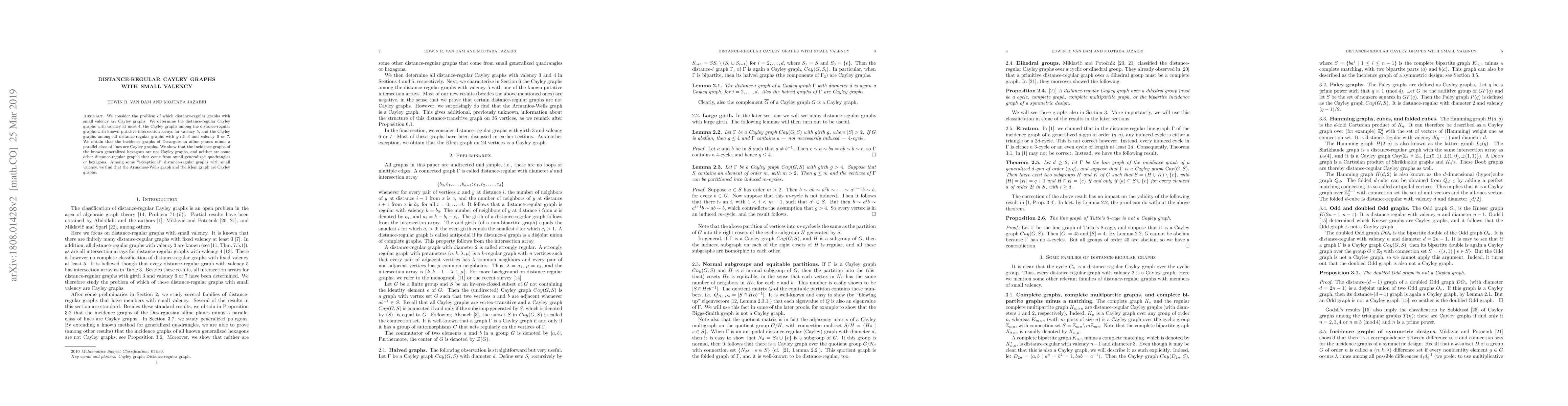 This paper identifies which distance-regular graphs with small valency (up to 7) are Cayley graphs. It finds that certain incidence graphs of Desarguesian affine planes and specific "exceptional" graphs like the Armanios-Wells and Klein graphs are Cayley graphs, while others, including generalized hexagons, are not.