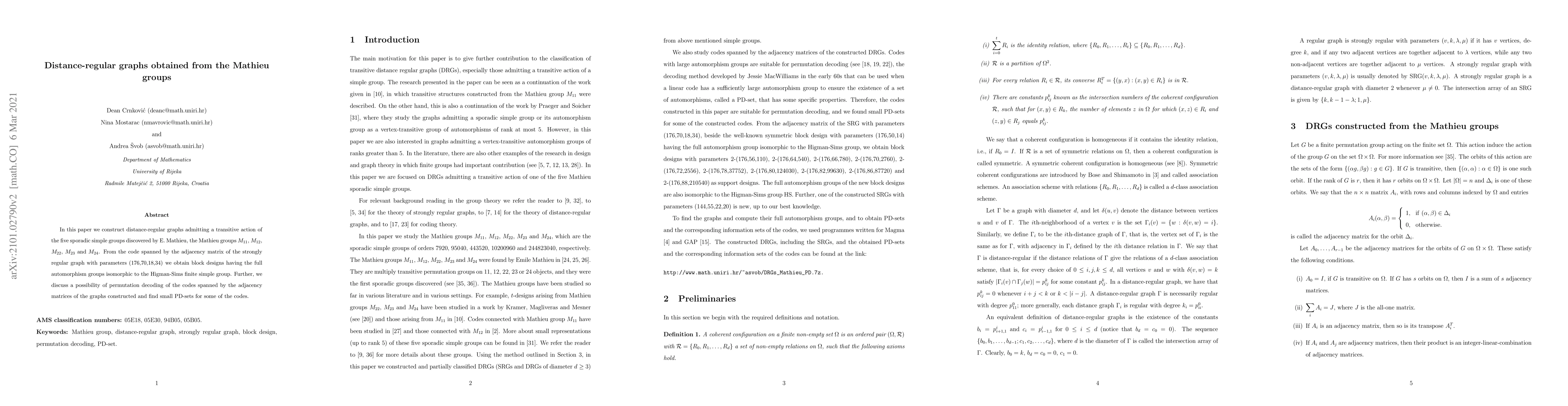 In this paper we construct distance-regular graphs admitting a transitive action of the five sporadic simple groups discovered by E. Mathieu, the Mathieu groups $M_{11}$, $M_{12}$, $M_{22}$, $M_{23}$ and $M_{24}$. From the code spanned by the adjacency matrix of the strongly regular graph with parameters (176,70,18,34) we obtain block designs having the full automorphism groups isomorphic to the Higman-Sims finite simple group. Further, we discuss a possibility of permutation decoding of the codes spanned by the adjacency matrices of the graphs constructed and find small PD-sets for some of the codes.