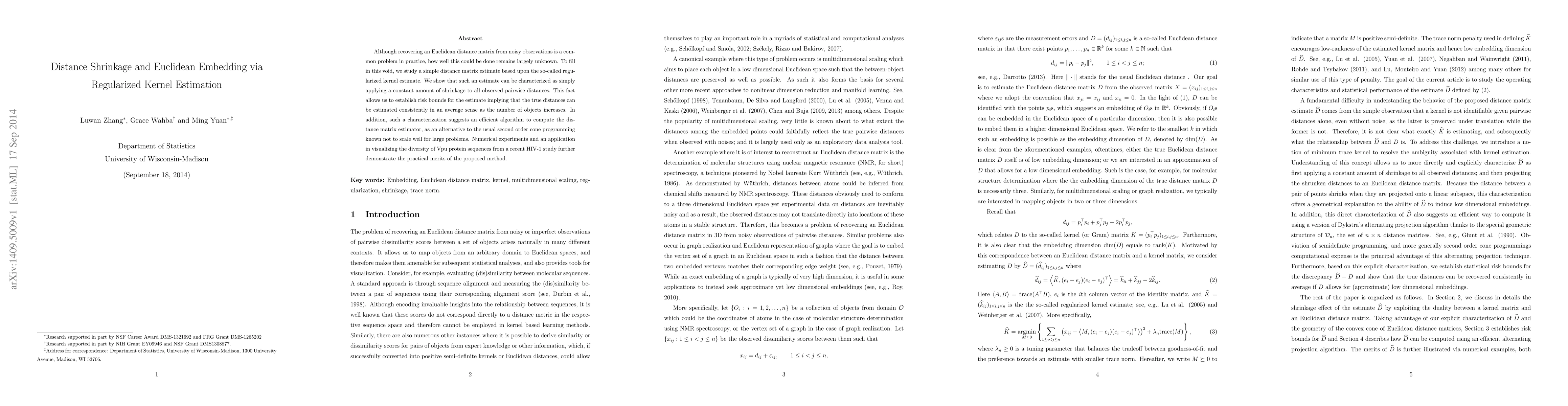 Although recovering an Euclidean distance matrix from noisy observations is a common problem in practice, how well this could be done remains largely unknown. To fill in this void, we study a simple distance matrix estimate based upon the so-called regularized kernel estimate. We show that such an estimate can be characterized as simply applying a constant amount of shrinkage to all observed pairwise distances. This fact allows us to establish risk bounds for the estimate implying that the true distances can be estimated consistently in an average sense as the number of objects increases. In addition, such a characterization suggests an efficient algorithm to compute the distance matrix estimator, as an alternative to the usual second order cone programming known not to scale well for large problems. Numerical experiments and an application in visualizing the diversity of Vpu protein sequences from a recent HIV-1 study further demonstrate the practical merits of the proposed method.