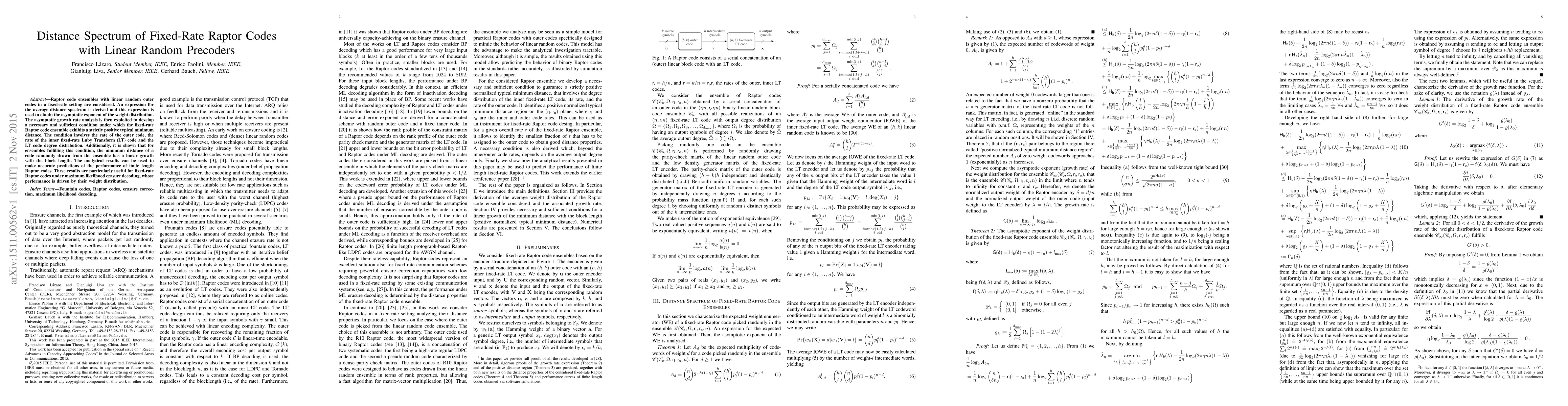 Researchers studied Raptor codes with linear random outer codes in fixed-rate settings, deriving an expression for the average distance spectrum and finding a necessary condition for strictly positive typical minimum distance. They also showed that under this condition, code distances grow linearly with block length.