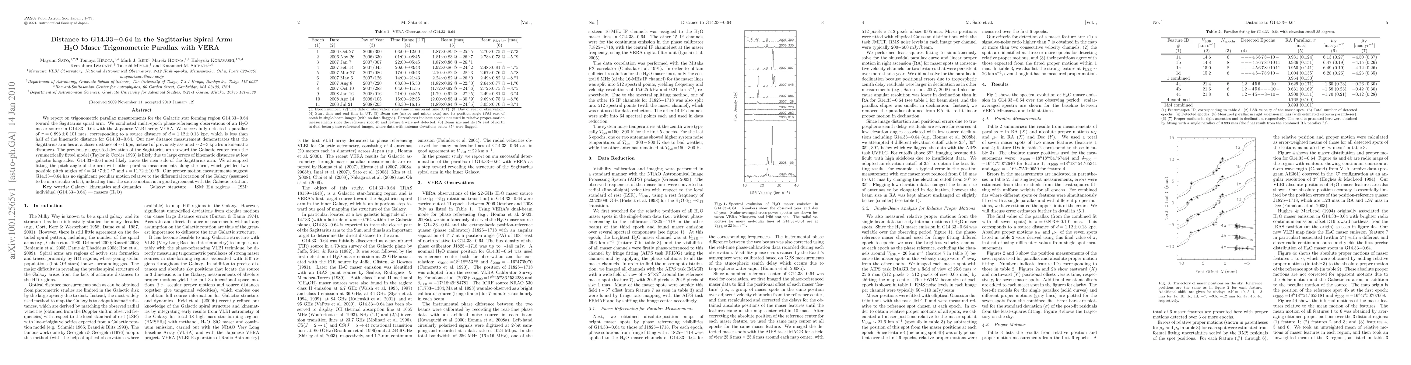 We report on trigonometric parallax measurements for the Galactic star forming region G14.33-0.64 toward the Sagittarius spiral arm. We conducted multi-epoch phase-referencing observations of an H2O maser source in G14.33-0.64 with the Japanese VLBI array VERA. We successfully detected a parallax of 0.893+/-0.101 mas, corresponding to a source distance of 1.12+/-0.13 kpc, which is less than half of the kinematic distance for G14.33-0.64. Our new distance measurement demonstrates that the Sagittarius arm lies at a closer distance of ~1 kpc, instead of previously assumed ~2-3 kpc from kinematic distances. The previously suggested deviation of the Sagittarius arm toward the Galactic center from the symmetrically fitted model (Taylor & Cordes 1993) is likely due to large errors of kinematic distances at low galactic longitudes. G14.33-0.64 most likely traces the near side of the Sagittarius arm. We attempted fitting the pitch angle of the arm with other parallax measurements along the arm, which yielded two possible pitch angles of i=34.7+/-2.7 degrees and i=11.2+/-10.5 degrees. Our proper motion measurements suggest G14.33-0.64 has no significant peculiar motion relative to the differential rotation of the Galaxy (assumed to be in a circular orbit), indicating that the source motion is in good agreement with the Galactic rotation.