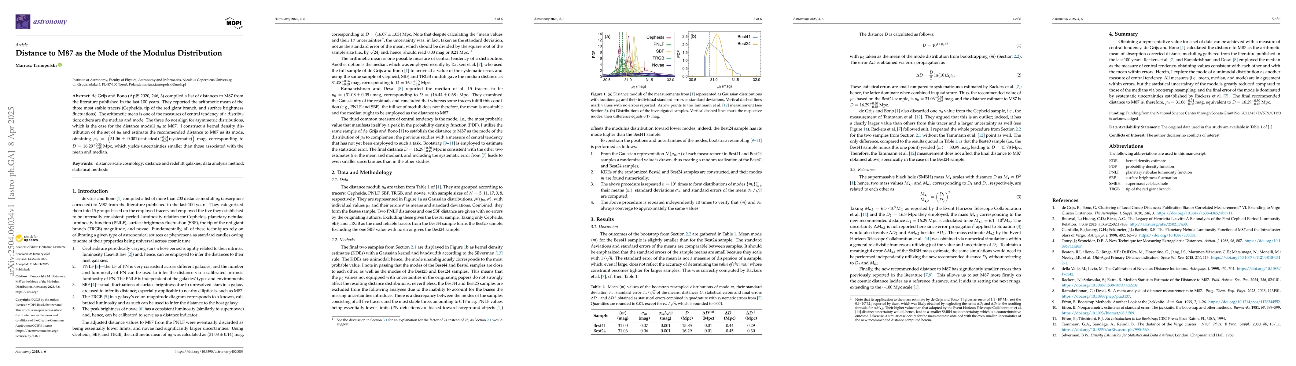 This work distinguishes itself by focusing on the mode of the distribution rather than the commonly used mean or median, leading to more precise distance estimates for M87.