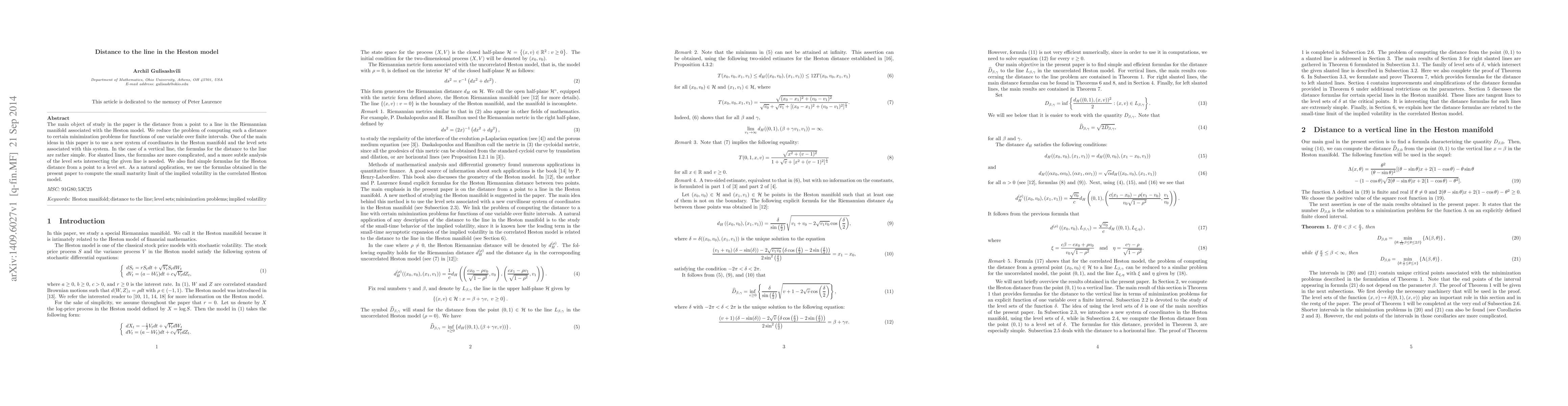 This paper investigates the distance from a point to a line in the Heston model's Riemannian manifold, simplifying it via minimization problems. It introduces a new coordinate system for the Heston manifold, yielding straightforward formulas for vertical lines and more complex analyses for slanted lines.
