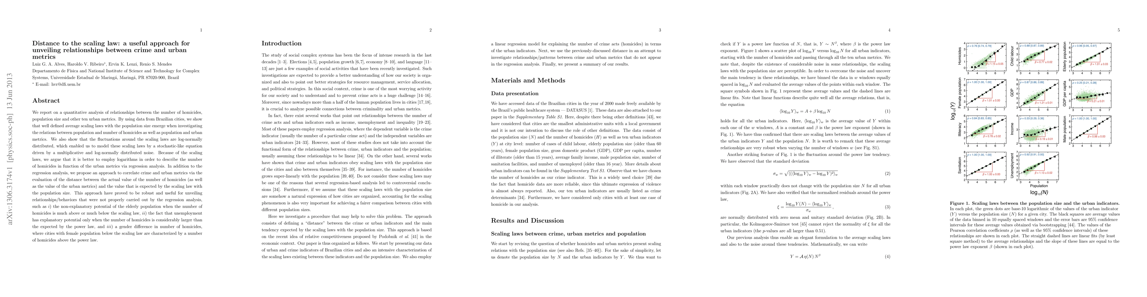 This paper investigates scaling laws between homicides, population, and urban metrics in Brazilian cities, revealing that homicides and urban metrics scale with population size. The study proposes a distance-based approach to uncover relationships beyond traditional regression, highlighting factors like unemployment and gender disparities that influence homicide rates.
