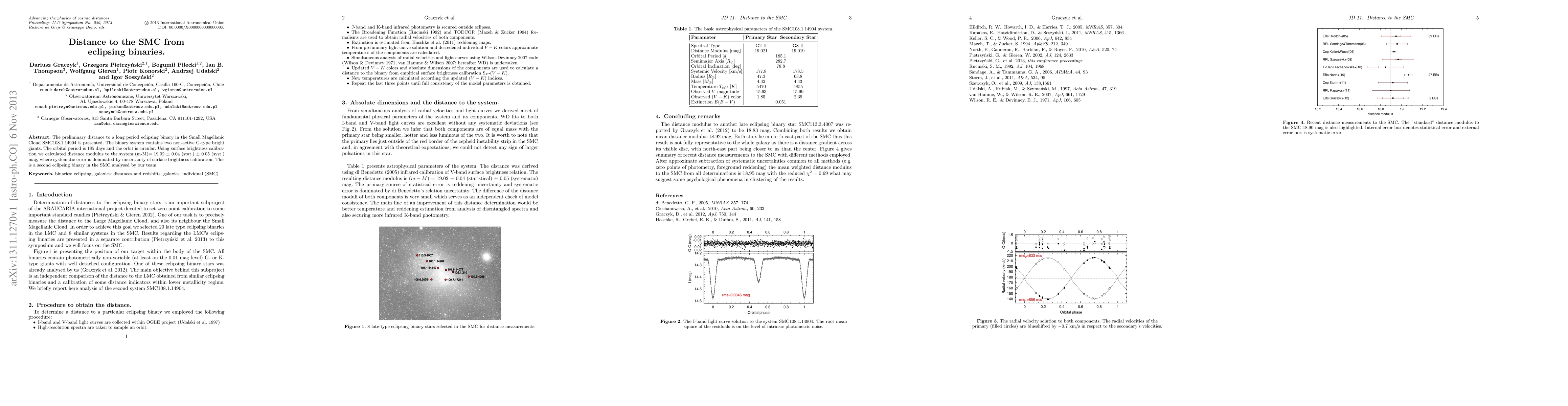 The preliminary distance to a long period eclipsing binary in the Small Magellanic Cloud SMC108.1.14904 is presented. The binary system contains two non-active G-type bright giants. The orbital period is 185 days and the orbit is circular. Using surface brightness calibration we calculated distance modulus to the system (m-M)= 19.02 +/- 0.04 (stat.) +/- 0.05 (syst.) mag, where systematic error is dominated by uncertainty of surface brightness calibration. This is a second eclipsing binary in the SMC analysed by our team.