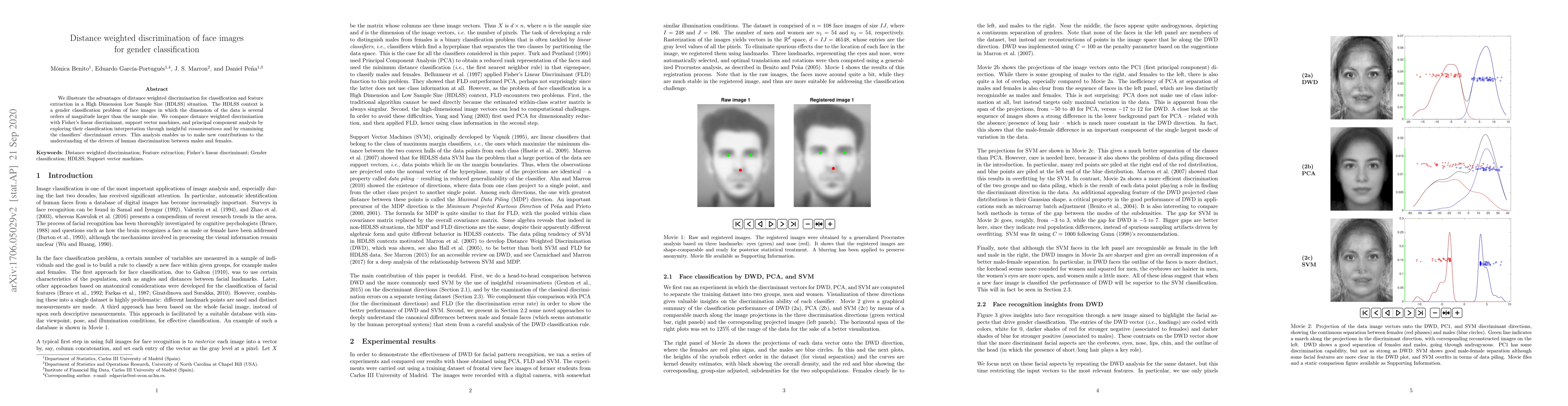 We illustrate the advantages of distance weighted discrimination for classification and feature extraction in a High Dimension Low Sample Size (HDLSS) situation. The HDLSS context is a gender classification problem of face images in which the dimension of the data is several orders of magnitude larger than the sample size. We compare distance weighted discrimination with Fisher's linear discriminant, support vector machines, and principal component analysis by exploring their classification interpretation through insightful visuanimations and by examining the classifiers' discriminant errors. This analysis enables us to make new contributions to the understanding of the drivers of human discrimination between males and females.