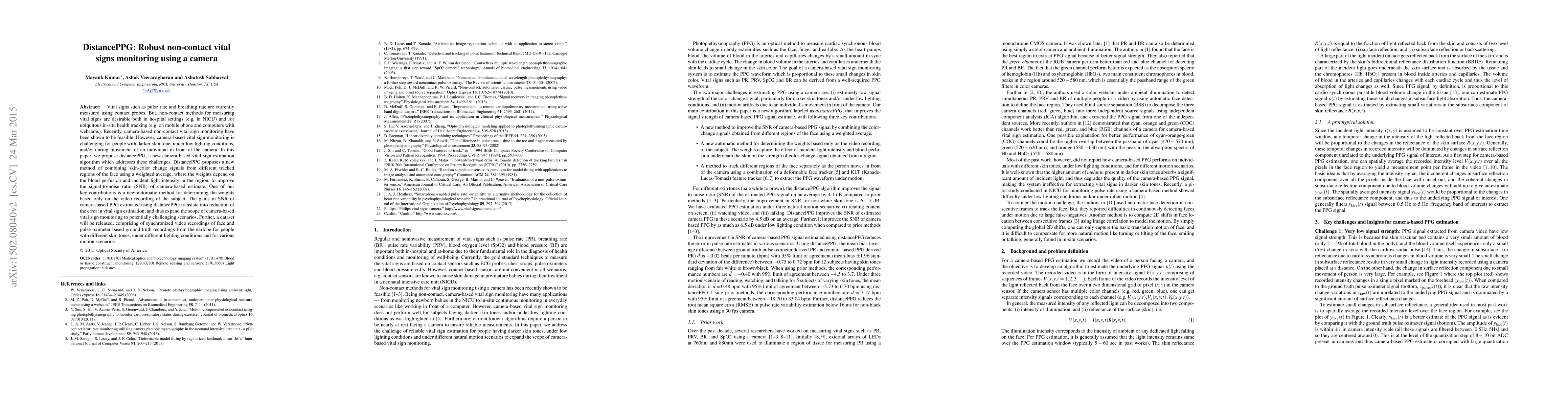 DistancePPG is a novel camera-based algorithm for non-contact vital sign monitoring that enhances signal-to-noise ratio by combining skin-color change signals from different facial regions. It introduces an automatic method to determine optimal weights based on video recordings, improving accuracy in challenging scenarios like low light or darker skin tones.