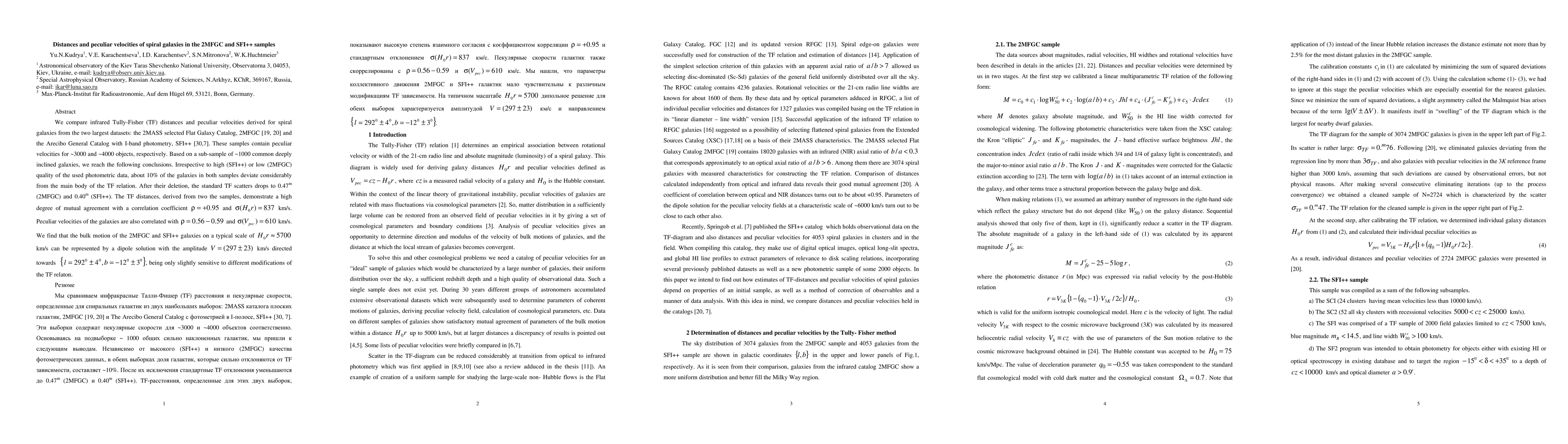 This study compares Tully-Fisher distances and peculiar velocities of spiral galaxies from the 2MFGC and SFI++ datasets, finding that about 10% of galaxies deviate from the TF relation. After excluding these outliers, the TF scatter reduces significantly, and the TF distances from both samples show high mutual agreement.