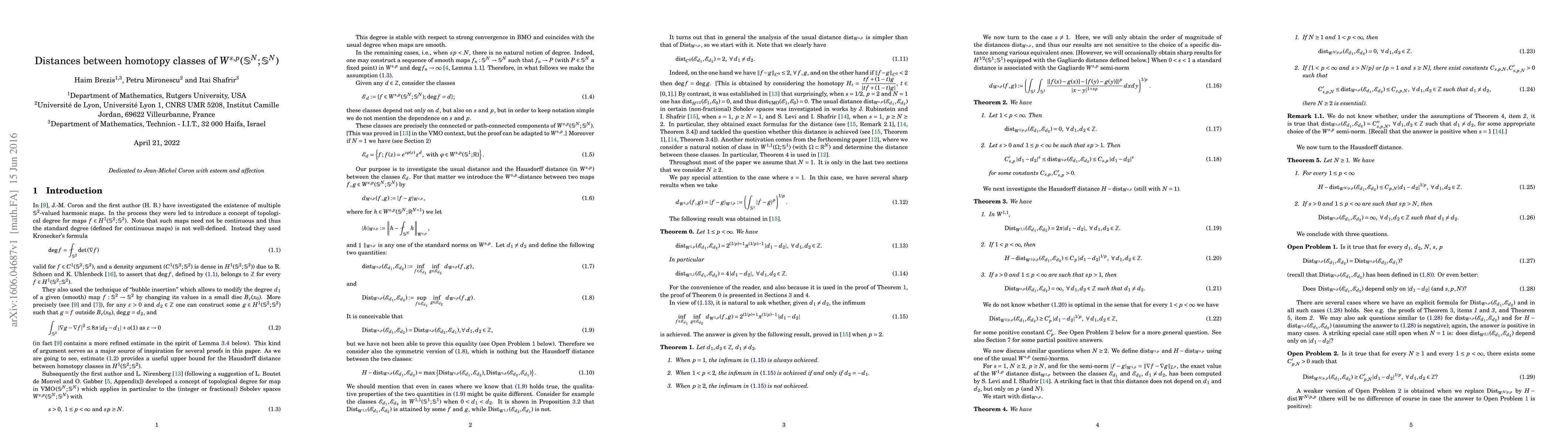 We introduce an equivalence relation on $W^{s,p}({\mathbb S}^N;{\mathbb S}^N)$ involving the topological degree, and we evaluate the distances (in the usual sense and in the Hausdorff sense) between the equivalence classes. In some special cases we even obtain exact formulas.