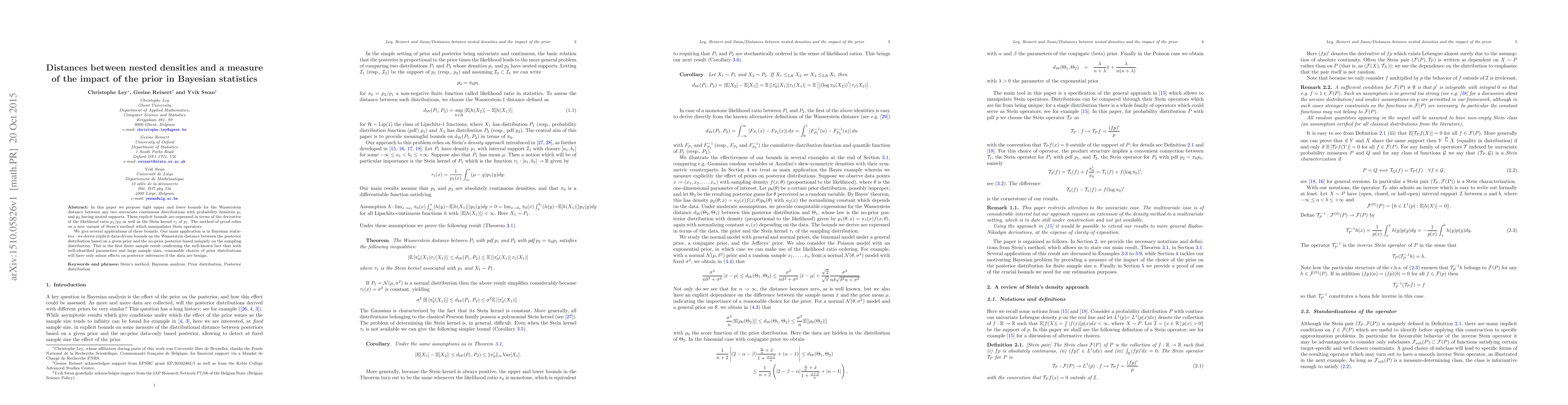 In this paper we propose tight upper and lower bounds for the Wasserstein distance between any two {{univariate continuous distributions}} with probability densities $p_1$ and $p_2$ having nested supports. These explicit bounds are expressed in terms of the derivative of the likelihood ratio $p_1/p_2$ as well as the Stein kernel $\tau_1$ of $p_1$. The method of proof relies on a new variant of Stein's method which manipulates Stein operators. We give several applications of these bounds. Our main application is in Bayesian statistics : we derive explicit data-driven bounds on the Wasserstein distance between the posterior distribution based on a given prior and the no-prior posterior based uniquely on the sampling distribution. This is the first finite sample result confirming the well-known fact that with well-identified parameters and large sample sizes, reasonable choices of prior distributions will have only minor effects on posterior inferences if the data are benign.
