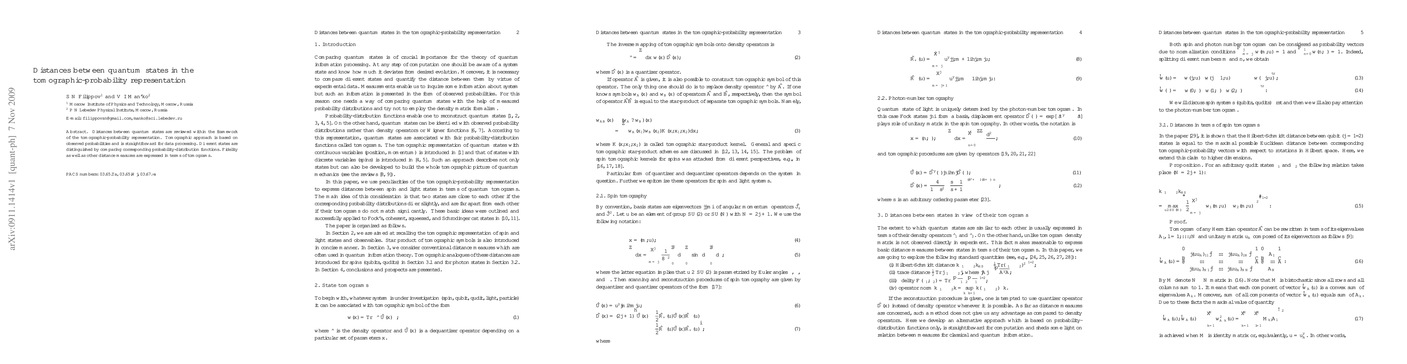 This paper reviews methods for quantifying distances between quantum states using the tomographic-probability representation, focusing on the straightforward processing of observed probabilities and comparing probability-distribution functions. Fidelity and various other distance measures are expressed in terms of tomograms.