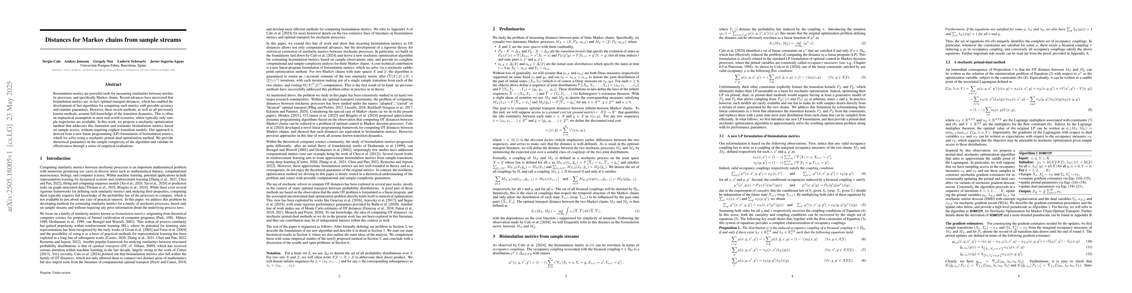 Bisimulation metrics are powerful tools for measuring similarities between stochastic processes, and specifically Markov chains. Recent advances have uncovered that bisimulation metrics are, in fact, optimal-transport distances, which has enabled the development of fast algorithms for computing such metrics with provable accuracy and runtime guarantees. However, these recent methods, as well as all previously known methods, assume full knowledge of the transition dynamics. This is often an impractical assumption in most real-world scenarios, where typically only sample trajectories are available. In this work, we propose a stochastic optimization method that addresses this limitation and estimates bisimulation metrics based on sample access, without requiring explicit transition models. Our approach is derived from a new linear programming (LP) formulation of bisimulation metrics, which we solve using a stochastic primal-dual optimization method. We provide theoretical guarantees on the sample complexity of the algorithm and validate its effectiveness through a series of empirical evaluations.