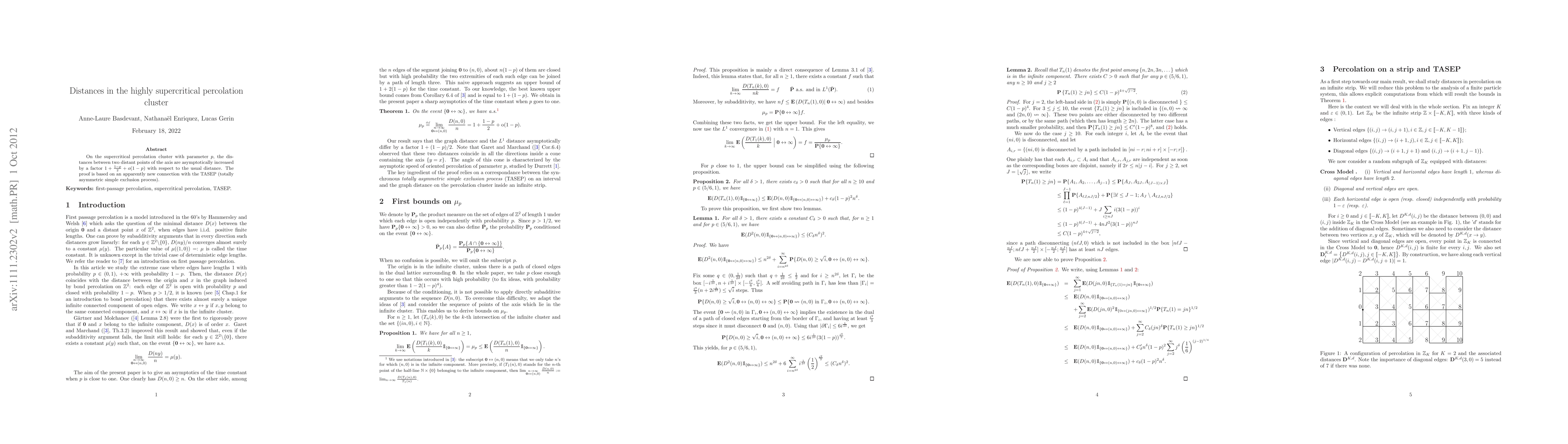 Summary: The paper investigates distances in the supercritical percolation cluster, showing they increase by a factor of 1+(1-p)/2+o(1-p) compared to usual distances, with a novel link to the TASEP (totally asymmetric simple exclusion process) underpinning the proof.