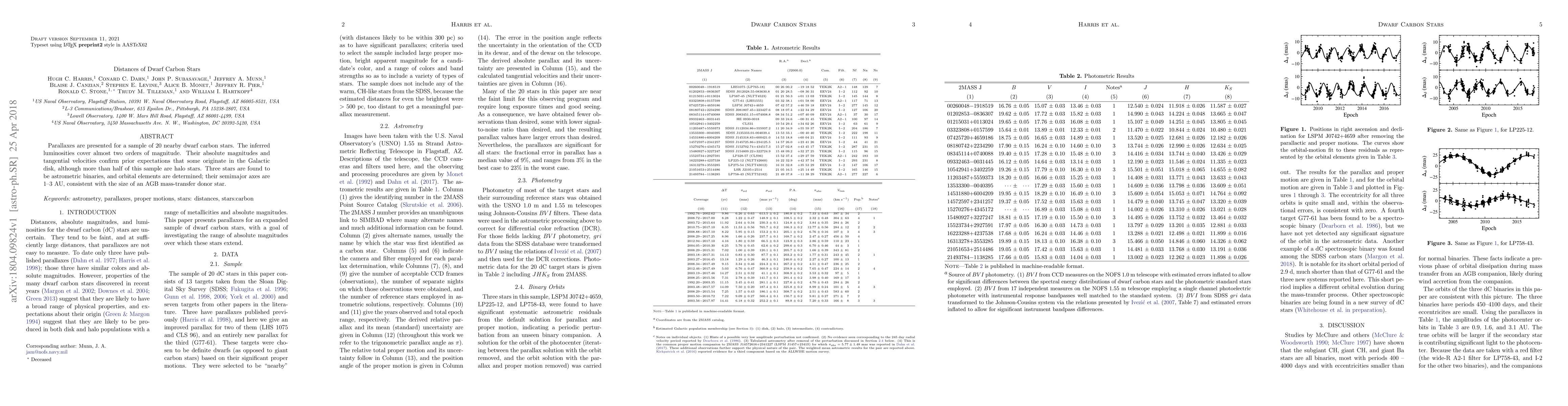 The paper presents parallaxes for 20 nearby dwarf carbon stars, revealing luminosities spanning almost two orders of magnitude. It confirms that some are disk stars, while others are halo stars, with three identified as astrometric binaries having semimajor axes of 1 -- 3 AU, suggesting origin from AGB mass-transfer donor stars.