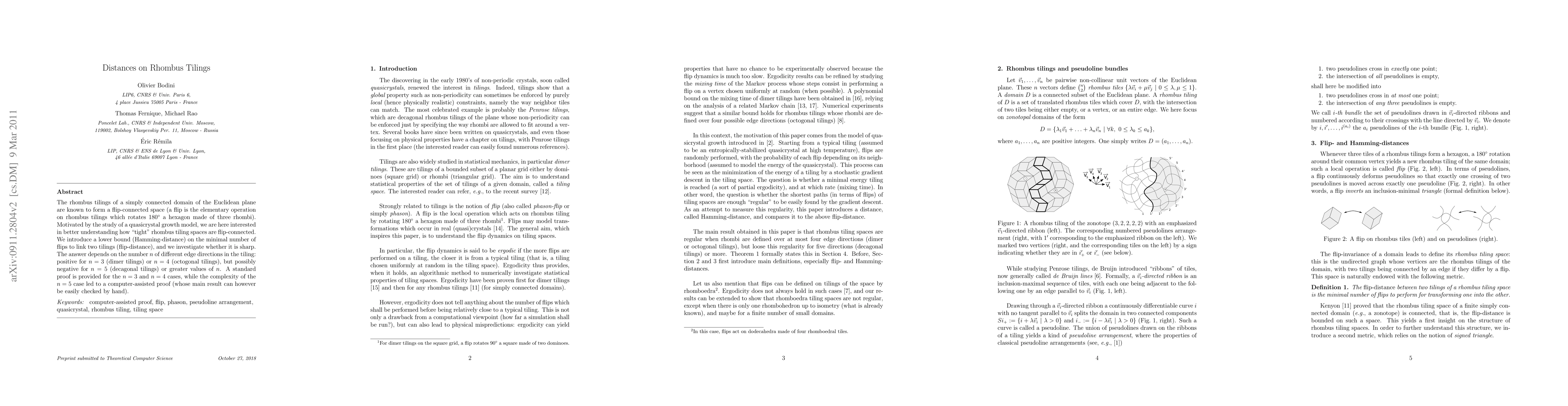 This paper studies the flip-connected distances in rhombus tiling spaces, introducing a Hamming-distance lower bound for the minimal number of flips needed to link two tilings. The bound is shown to be tight for tilings with 3 or 4 edge directions but may not hold for 5 or more edge directions, with proofs provided for simpler cases and a computer-assisted proof for the n=5 case.