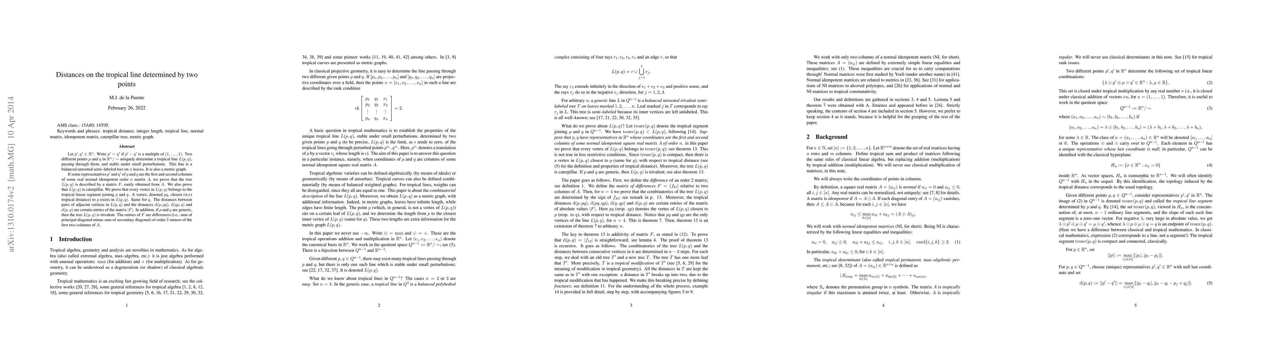 Let $p',q'\in R^n$. Write $p'\sim q'$ if $p'-q'$ is a multiple of $(1,\ldots,1)$. Two different points $p$ and $q$ in $R^n/\sim$ uniquely determine a tropical line $L(p,q)$, passing through them, and stable under small perturbations. This line is a balanced unrooted semi--labeled tree on $n$ leaves. It is also a metric graph. If some representatives $p'$ and $q'$ of $p$ and $q$ are the first and second columns of some real normal idempotent order $n$ matrix $A$, we prove that the tree $L(p,q)$ is described by a matrix $F$, easily obtained from $A$. We also prove that $L(p,q)$ is caterpillar. We prove that every vertex in $L(p,q)$ belongs to the tropical linear segment joining $p$ and $q$. A vertex, denoted $pq$, closest (w.r.t tropical distance) to $p$ exists in $L(p,q)$. Same for $q$. The distances between pairs of adjacent vertices in $L(p,q)$ and the distances $\dd(p,pq)$, $\dd(qp,q)$ and $\dd(p,q)$ are certain entries of the matrix $|F|$. In addition, if $p$ and $q$ are generic, then the tree $L(p,q)$ is trivalent. The entries of $F$ are differences (i.e., sum of principal diagonal minus sum of secondary diagonal) of order 2 minors of the first two columns of $A$.