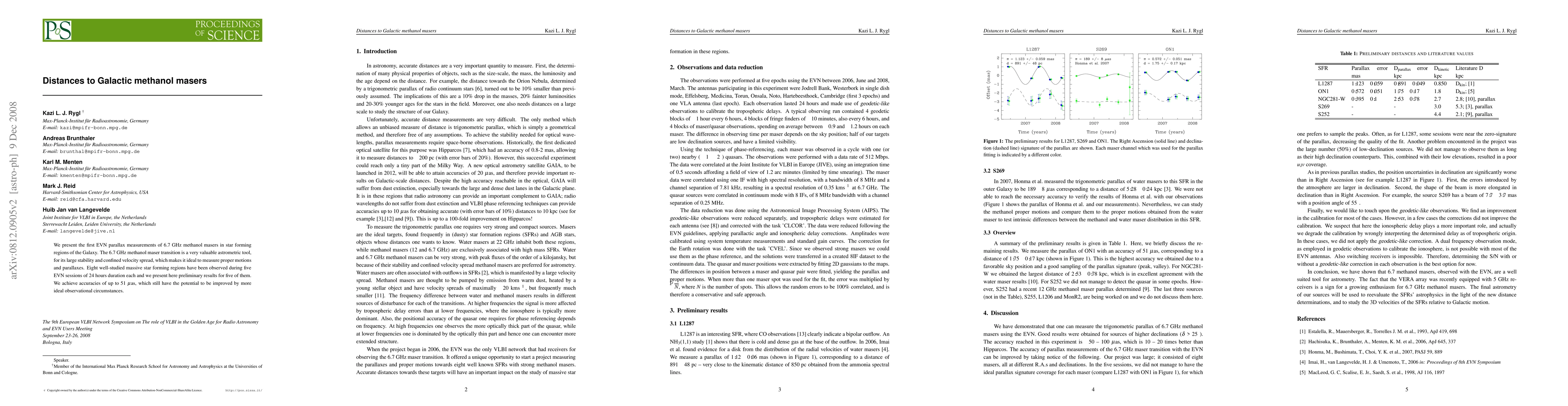 We present the first EVN parallax measurements of 6.7 GHz methanol masers in star forming regions of the Galaxy. The 6.7 GHz methanol maser transition is a very valuable astrometric tool, for its large stability and confined velocity spread, which makes it ideal to measure proper motions and parallaxes. Eight well-studied massive star forming regions have been observed during five EVN sessions of 24 hours duration each and we present here preliminary results for five of them. We achieve accuracies of up to 51 $\mu$as, which still have the potential to be proved by more ideal observational circumstances.