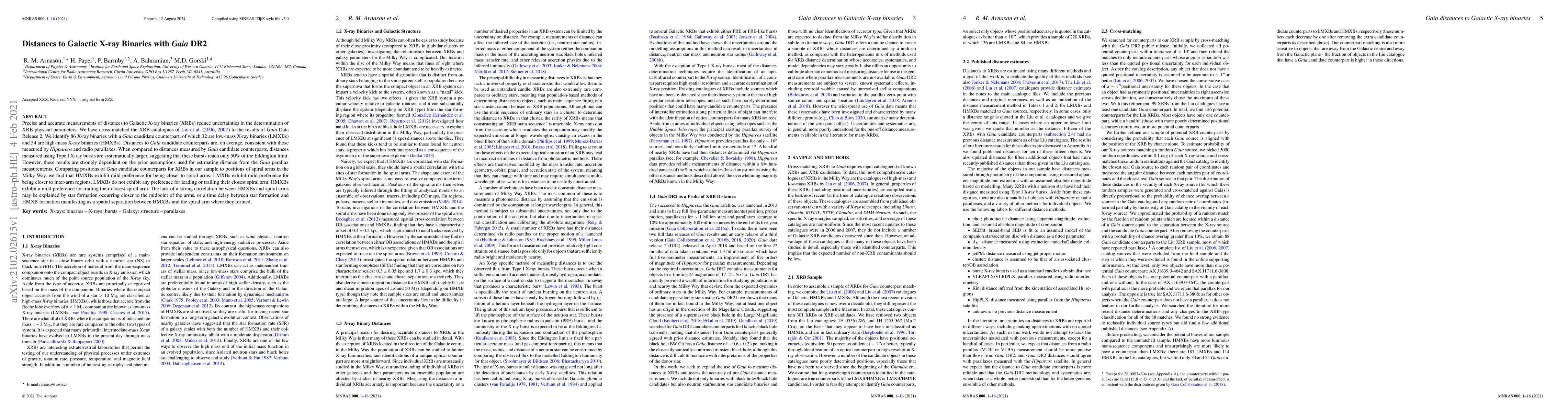 This study uses Gaia DR2 data to measure distances to Galactic X-ray binaries with high accuracy, revealing preferences of high-mass binaries for proximity to spiral arms, while low-mass binaries show no such preference.