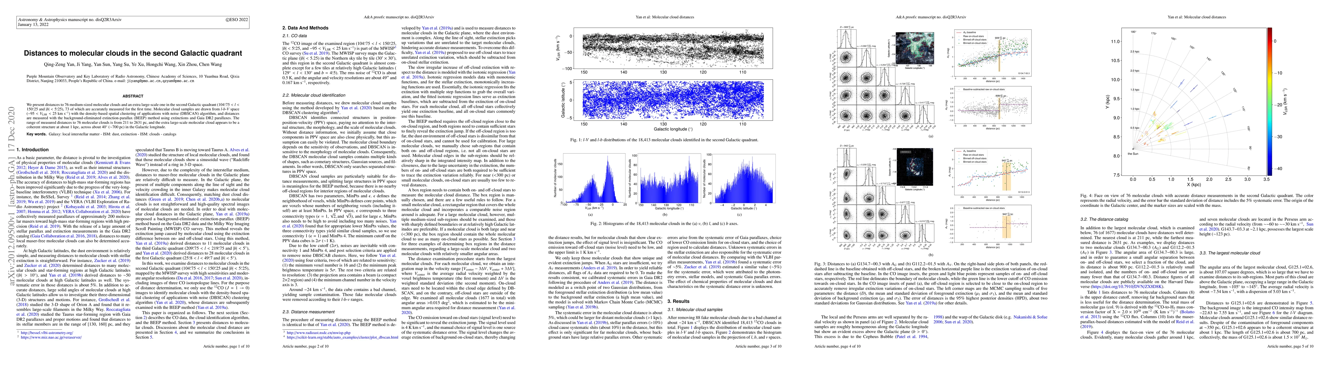 This paper reports distances to 76 molecular clouds in the second Galactic quadrant, utilizing the DBSCAN algorithm and the BEEP method for accurate measurements. The distances range from 211 to 2631 pc, with an additional large-scale cloud identified at approximately 1 kpc.