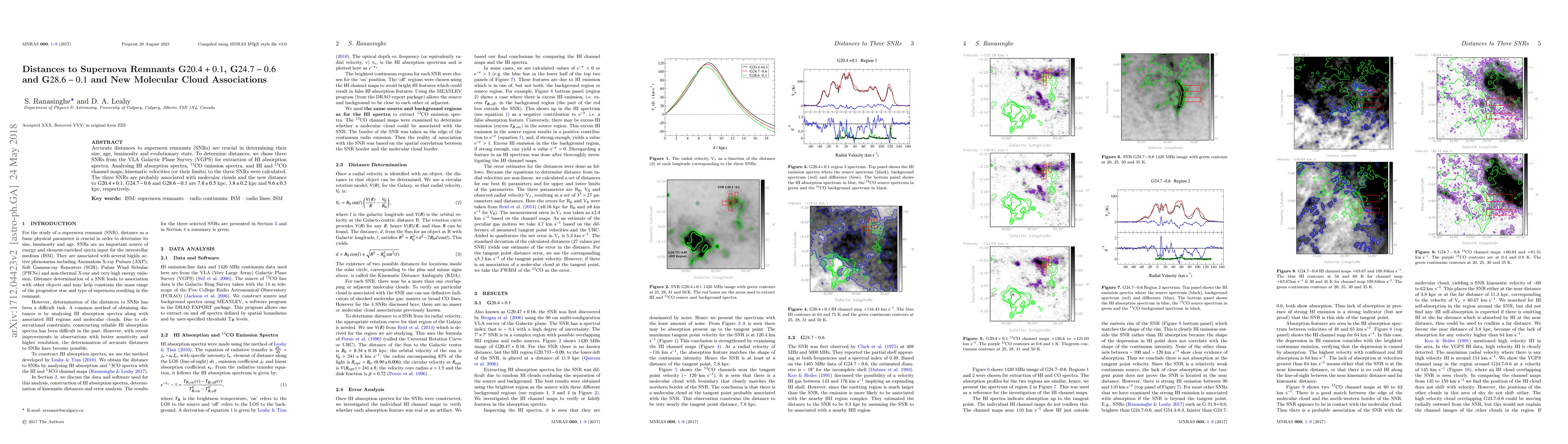 Accurate distances to supernova remnants (SNRs) are crucial in determining their size, age, luminosity and evolutionary state. To determine distances, we chose three SNRs from the VLA Galactic Plane Survey (VGPS) for extraction of HI absorption spectra. Analysing HI absorption spectra, $^{13}$CO emission spectra, and HI and $^{13}$CO channel maps, kinematic velocities (or their limits) to the three SNRs were calculated. The three SNRs are probably associated with molecular clouds and the new distance to G$20.4+0.1$, G$24.7-0.6$ and G$28.6-0.1$ are $7.8 \pm0.5$ kpc, $3.8\pm 0.2 $ kpc and $ 9.6 \pm 0.3 $ kpc, respectively.