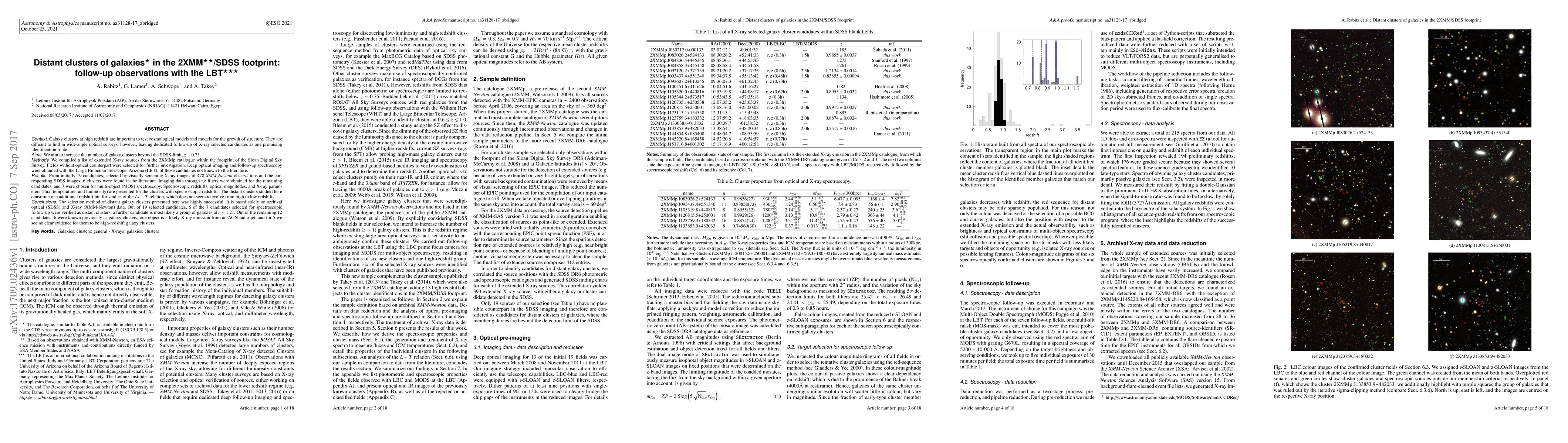 Context: Galaxy clusters at high redshift are important to test cosmological models and models for the growth of structure. They are difficult to find in wide-angle optical surveys, however, leaving dedicated follow-up of X-ray selected candidates as one promising identification route. Aims: We aim to increase the number of galaxy clusters beyond the SDSS-limit, z ~ 0.75. Methods: We compiled a list of extended X-ray sources from the 2XMMp catalogue within the footprint of the Sloan Digital Sky Survey. Fields without optical counterpart were selected for further investigation. Deep optical imaging and follow-up spectroscopy were obtained with the Large Binocular Telescope, Arizona (LBT), of those candidates not known to the literature. Results: From initially 19 candidates, selected by visually screening X-ray images of 478 XMM-Newton observations and the corresponding SDSS images, 6 clusters were found in the literature. Imaging data through r,z filters were obtained for the remaining candidates, and 7 were chosen for multi-object (MOS) spectroscopy. Spectroscopic redshifts, optical magnitudes, and X-ray parameters (flux, temperature, and luminosity) are presented for the clusters with spectroscopic redshifts. The distant clusters studied here constitute one additional redshift bin for studies of the L-T relation, which does not seem to evolve from high to low redshifts. ...