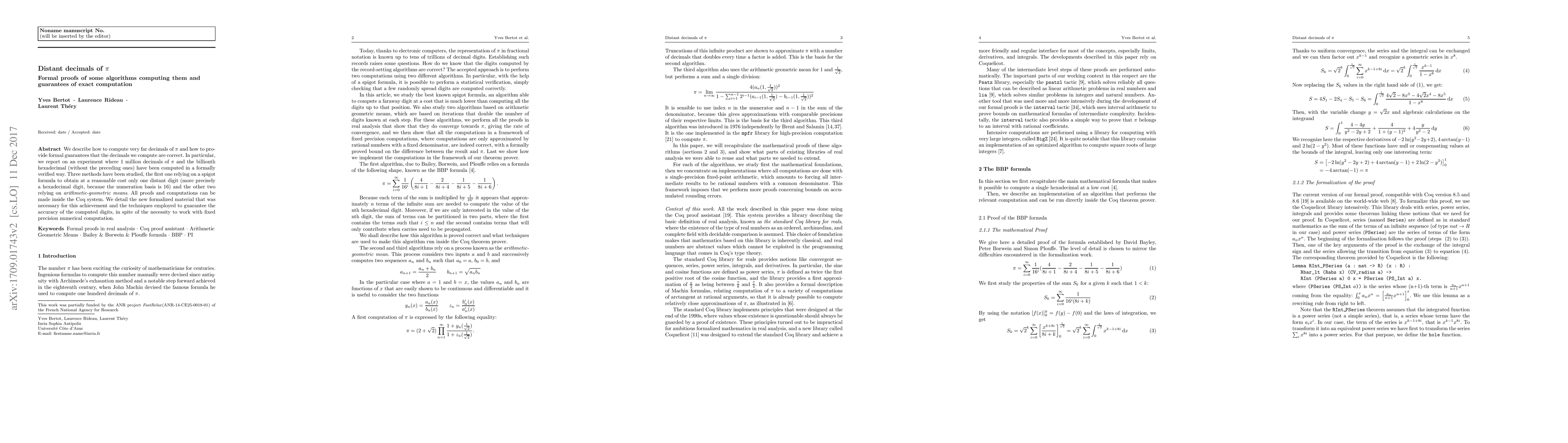 We describe how to compute very far decimals of $$\pi$$ and how to provide formal guarantees that the decimals we compute are correct. In particular, we report on an experiment where 1 million decimals of $$\pi$$ and the billionth hexadecimal (without the preceding ones) have been computed in a formally verified way. Three methods have been studied, the first one relying on a spigot formula to obtain at a reasonable cost only one distant digit (more precisely a hexadecimal digit, because the numeration basis is 16) and the other two relying on arithmetic-geometric means. All proofs and computations can be made inside the Coq system. We detail the new formalized material that was necessary for this achievement and the techniques employed to guarantee the accuracy of the computed digits, in spite of the necessity to work with fixed precision numerical computation.