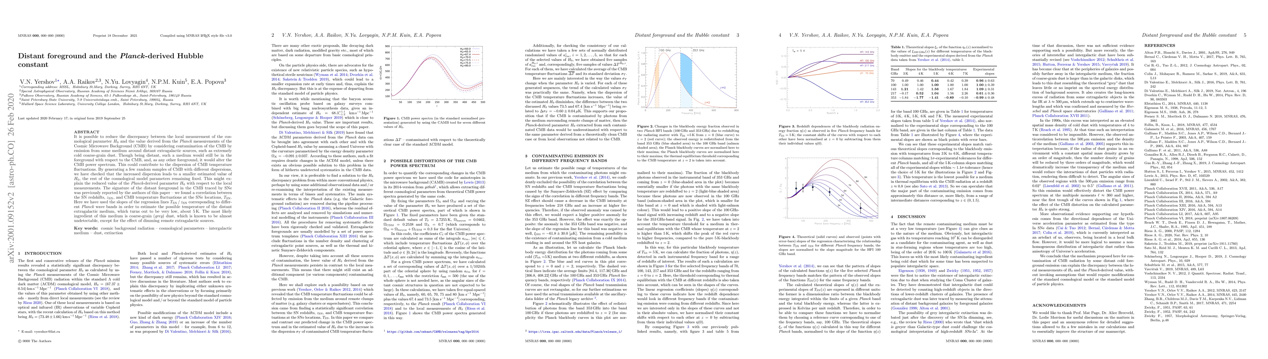 It is possible to reduce the discrepancy between the local measurement of the cosmological parameter $H_0$ and the value derived from the $Planck$ measurements of the Cosmic Microwave Background (CMB) by considering contamination of the CMB by emission from some medium around distant extragalactic sources, such as extremely cold coarse-grain dust. Though being distant, such a medium would still be in the foreground with respect to the CMB, and, as any other foreground, it would alter the CMB power spectrum. This could contribute to the dispersion of CMB temperature fluctuations. By generating a few random samples of CMB with different dispersions, we have checked that the increased dispersion leads to a smaller estimated value of $H_0$, the rest of the cosmological model parameters remaining fixed. This might explain the reduced value of the $Planck$-derived parameter $H_0$ with respect to the local measurements. The signature of the distant foreground in the CMB traced by SNe was previously reported by the authors of this paper -- we found a correlation between the SN redshifts, $z_{\rm SN}$, and CMB temperature fluctuations at the SNe locations, $T_{\rm SN}$. Here we have used the slopes of the regression lines $T_{\rm SN}\,/\,z_{\rm SN}$ corresponding to different {\it Planck} wave bands in order to estimate the possible temperature of the distant extragalactic medium, which turns out to be very low, about 5\,K. The most likely ingredient of this medium is coarse-grain ($grey$) dust, which is known to be almost undetectable, except for the effect of dimming remote extragalactic sources.