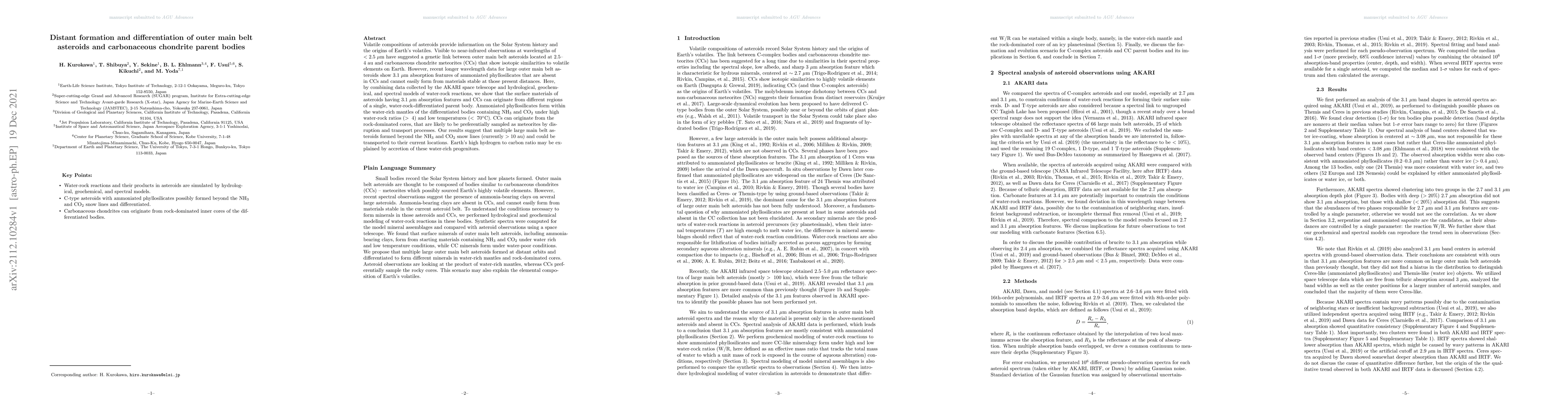 This paper investigates the origins of outer main belt asteroids and carbonaceous chondrites, proposing that they formed from different regions of a single differentiated parent body. Ammoniated phyllosilicates in the asteroids formed in water-rich mantles, while carbonaceous chondrites originated from rock-dominated cores, suggesting formation beyond the NH$_3$ and CO$_2$ snow lines and subsequent transport to current locations.