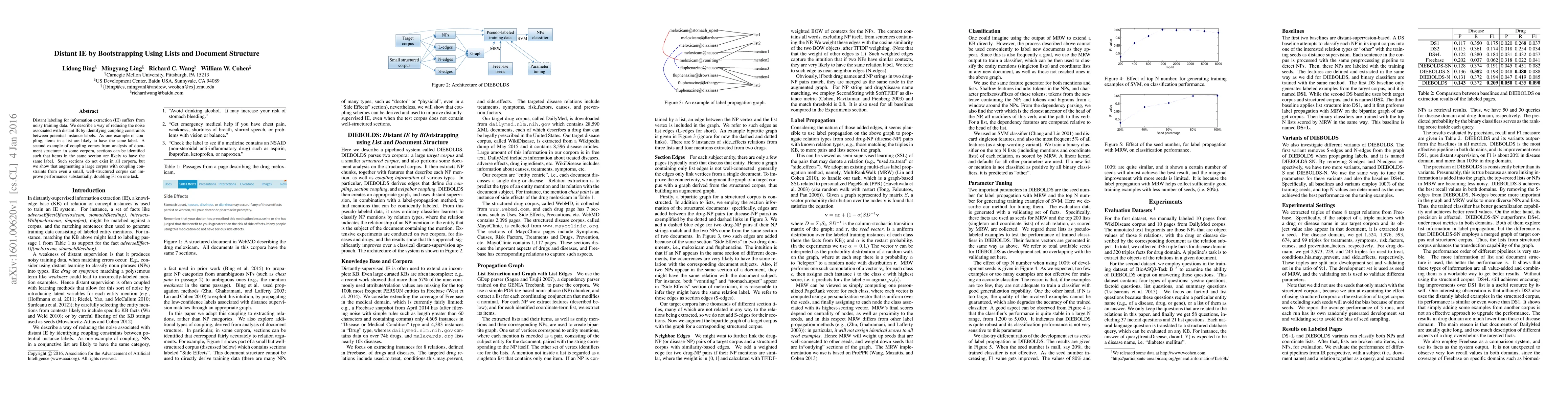 This paper proposes a method to reduce noise in distant information extraction by identifying coupling constraints between instance labels, such as items in lists or sections within documents. Experiments show that augmenting a large corpus with coupling constraints from a small, well-structured corpus can significantly improve performance, doubling F1 score on one task.