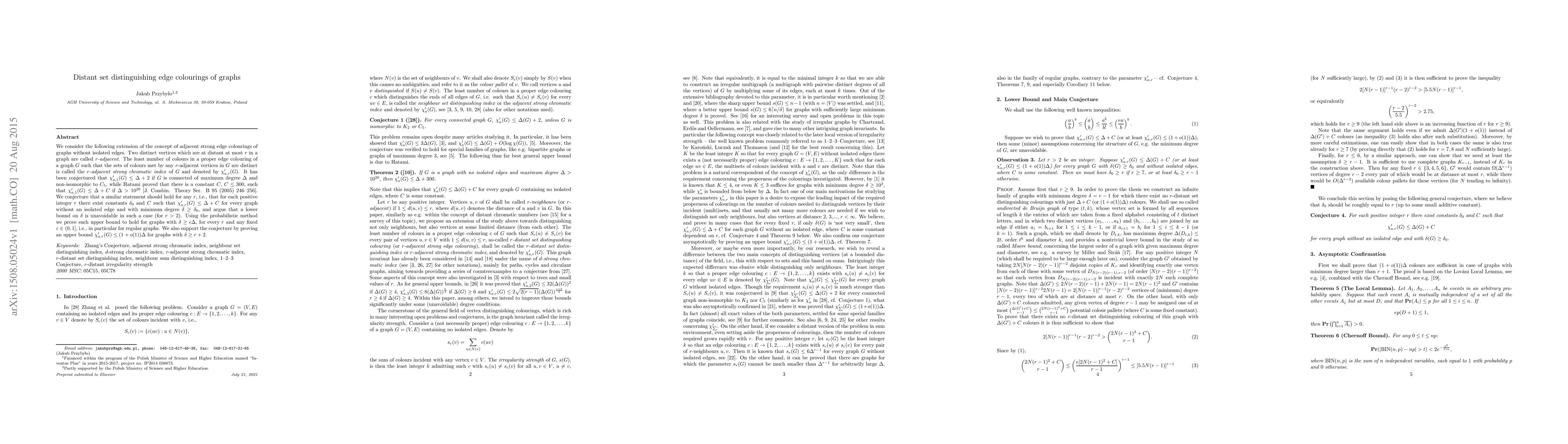 We consider the following extension of the concept of adjacent strong edge colourings of graphs without isolated edges. Two distinct vertices which are at distant at most $r$ in a graph are called $r$-adjacent. The least number of colours in a proper edge colouring of a graph $G$ such that the sets of colours met by any $r$-adjacent vertices in $G$ are distinct is called the $r$-adjacent strong chromatic index of $G$ and denoted by $\chi'_{a,r}(G)$. It has been conjectured that $\chi'_{a,1}(G)\leq\Delta+2$ if $G$ is connected of maximum degree $\Delta$ and non-isomorphic to $C_5$, while Hatami proved that there is a constant $C$, $C\leq 300$, such that $\chi'_{a,1}(G)\leq\Delta+C$ if $\Delta>10^{20}$ [J. Combin. Theory Ser. B 95 (2005) 246--256]. We conjecture that a similar statement should hold for any $r$, i.e., that for each positive integer $r$ there exist constants $\delta_0$ and $C$ such that $\chi'_{a,r}(G) \leq \Delta+C$ for every graph without an isolated edge and with minimum degree $\delta \geq \delta_0$, and argue that a lower bound on $\delta$ is unavoidable in such a case (for $r>2$). Using the probabilistic method we prove such upper bound to hold for graphs with $\delta\geq \epsilon\Delta$, for every $r$ and any fixed $\varepsilon\in(0,1]$, i.e., in particular for regular graphs. We also support the conjecture by proving an upper bound $\chi'_{a,r}(G) \leq (1+o(1))\Delta$ for graphs with $\delta\geq r+2$.