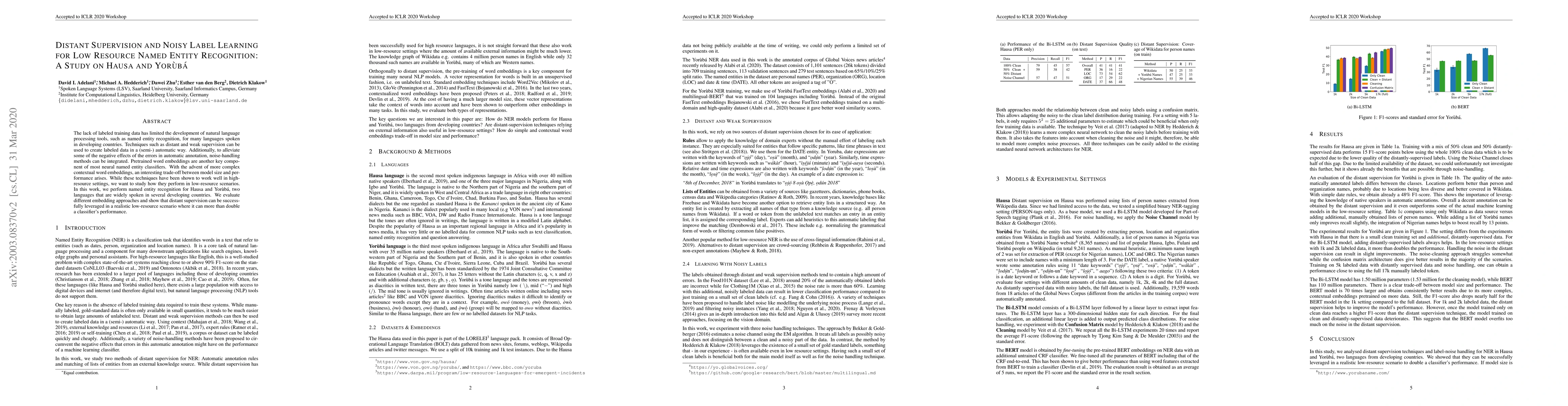 This study explores distant supervision and noisy label learning techniques to enhance named entity recognition (NER) for low-resource languages, specifically Hausa and Yoruba. The research demonstrates that distant supervision can significantly improve classifier performance in scenarios with limited labeled data.