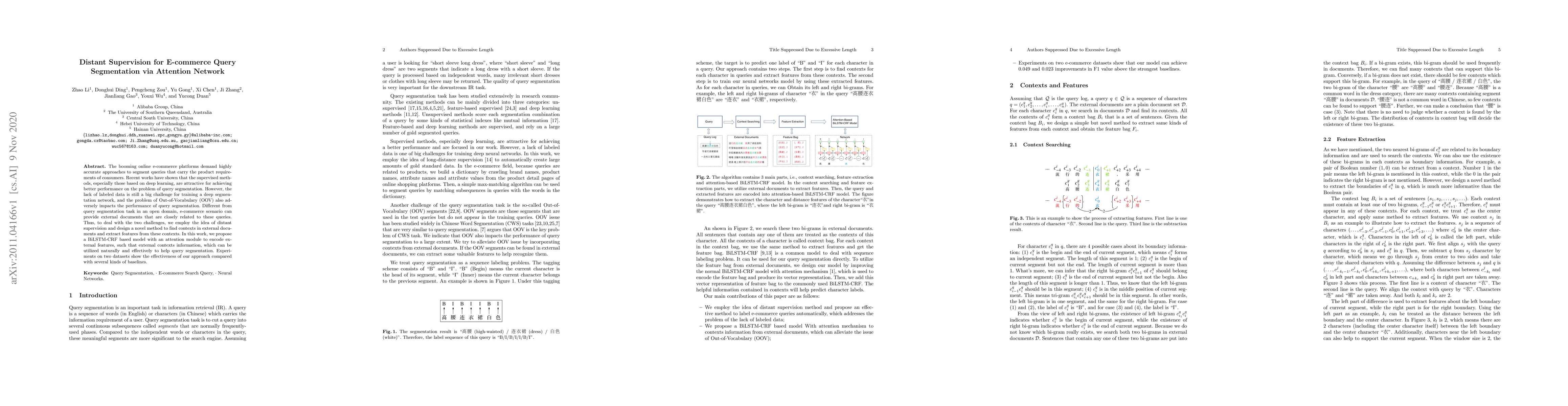 This paper proposes a BiLSTM-CRF model with an attention module for e-commerce query segmentation, utilizing distant supervision from related external documents to address the lack of labeled data and Out-of-Vocabulary issues, achieving better performance compared to baselines.