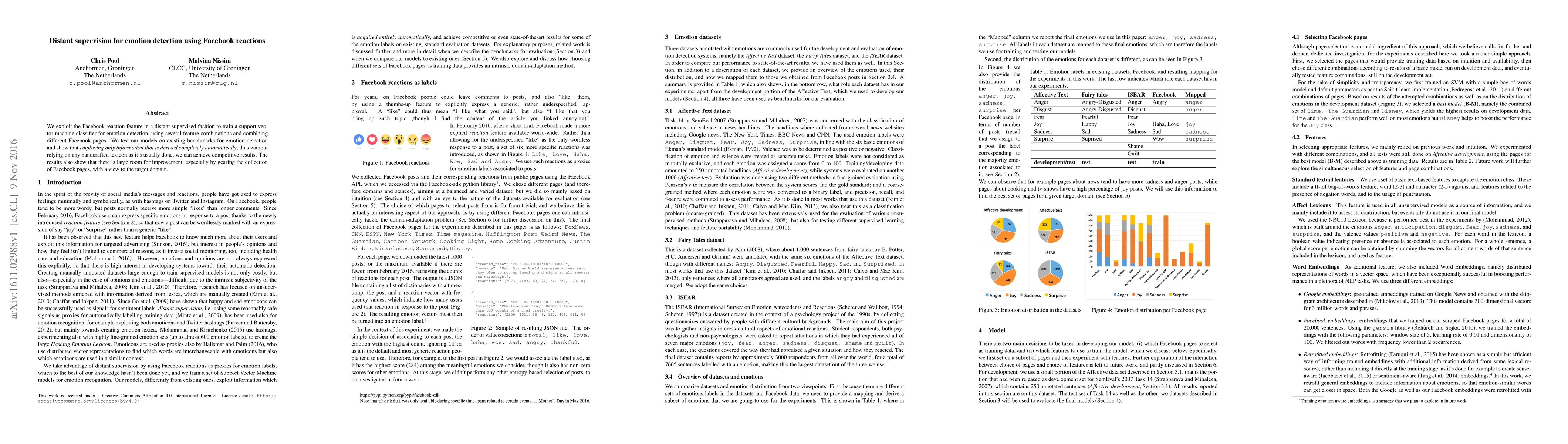 This research uses Facebook reactions as distant supervision to train a support vector machine for emotion detection, achieving competitive results without handcrafted lexicons. While promising, the study indicates significant room for improvement by tailoring the selection of Facebook pages to the target domain.