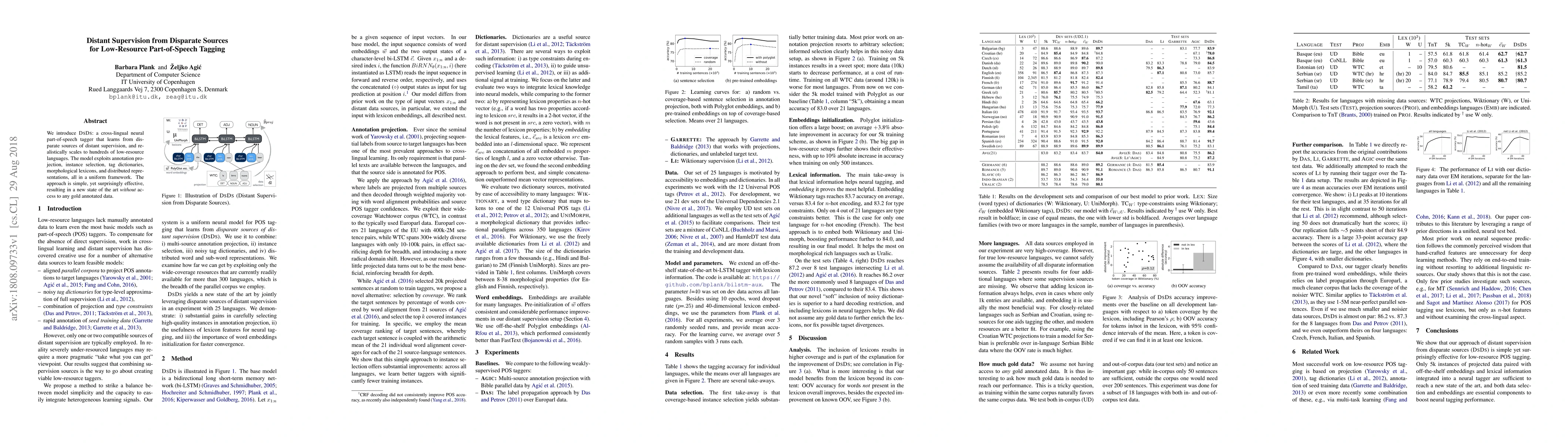 A new neural part-of-speech tagger called DsDs achieves state-of-the-art results on low-resource languages without gold annotated data, using diverse sources of distant supervision. The approach is simple yet effective for hundreds of languages.