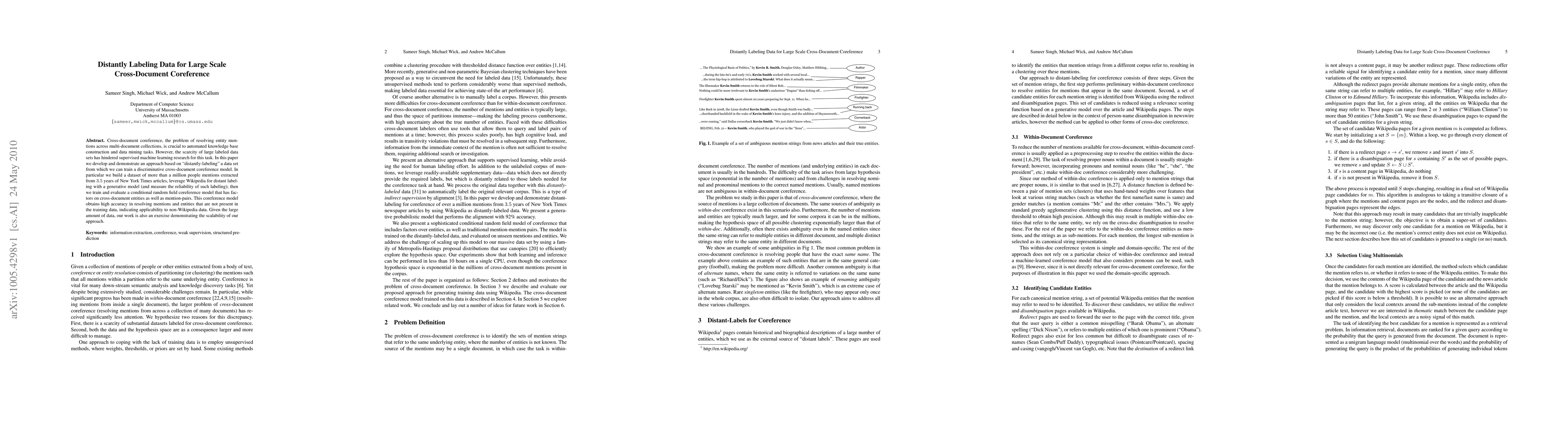 This paper presents a method for distantly labeling a large dataset to train a cross-document coreference model, using a dataset of over a million people mentions from New York Times articles and Wikipedia for distant labeling. The resulting conditional random field model achieves high accuracy in resolving coreferences, demonstrating the scalability and applicability of the approach.