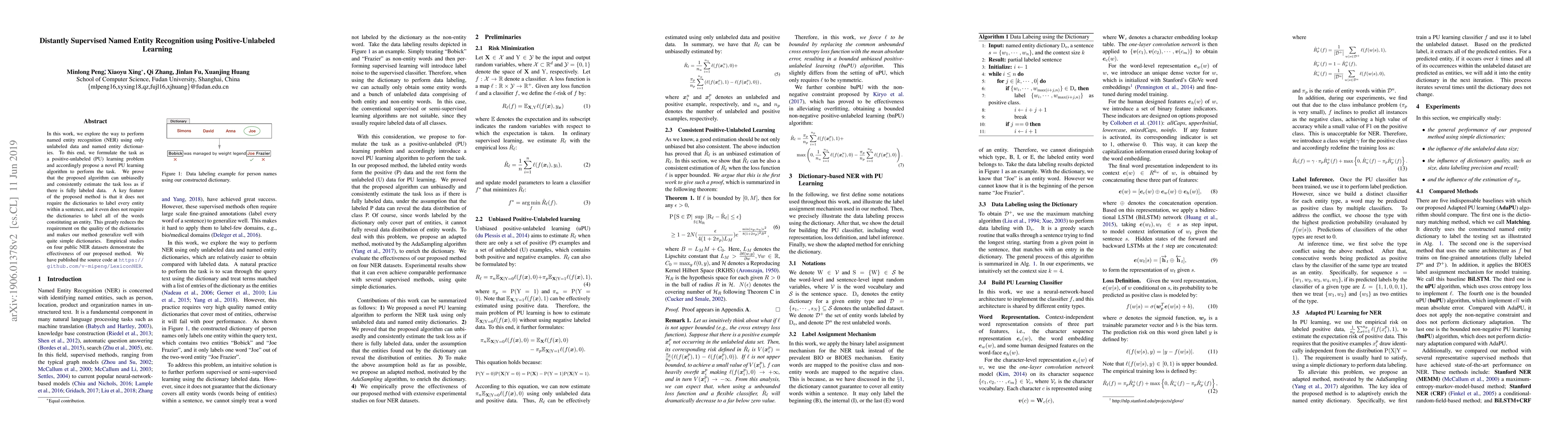 The paper proposes a novel Positive-Unlabeled (PU) learning algorithm for Named Entity Recognition (NER) using only unlabeled data and named entity dictionaries. It formulates NER as a PU learning problem and proves the proposed algorithm can unbiasedly and consistently estimate the task loss as if there is fully labeled data.