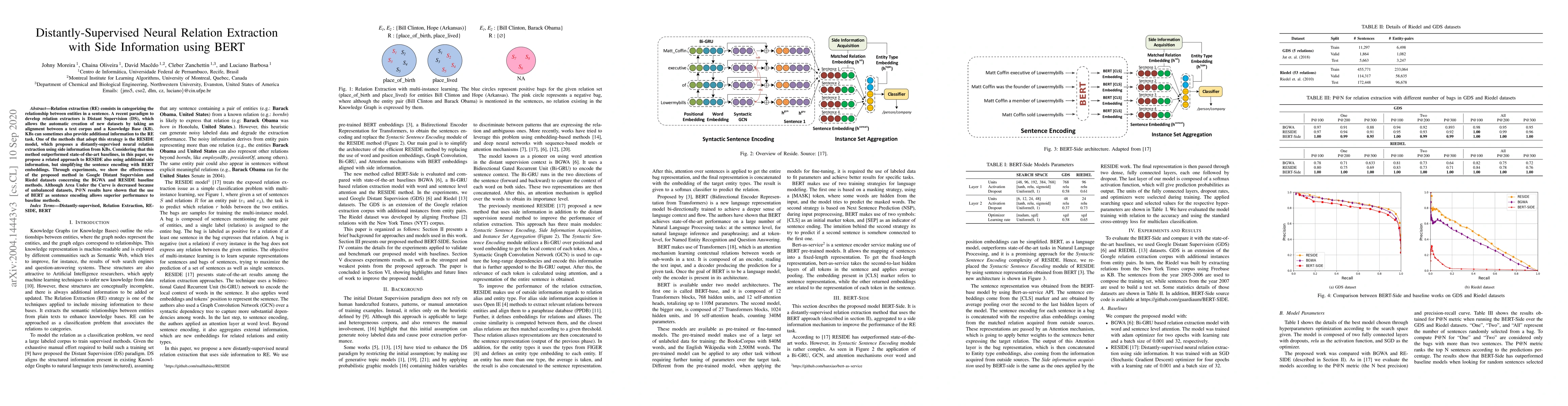 This paper proposes a distantly-supervised neural relation extraction method using BERT embeddings and side information from Knowledge Bases, demonstrating improved performance over baselines on Google Distant Supervision and Riedel datasets, despite some decrease in AUC due to dataset imbalance.