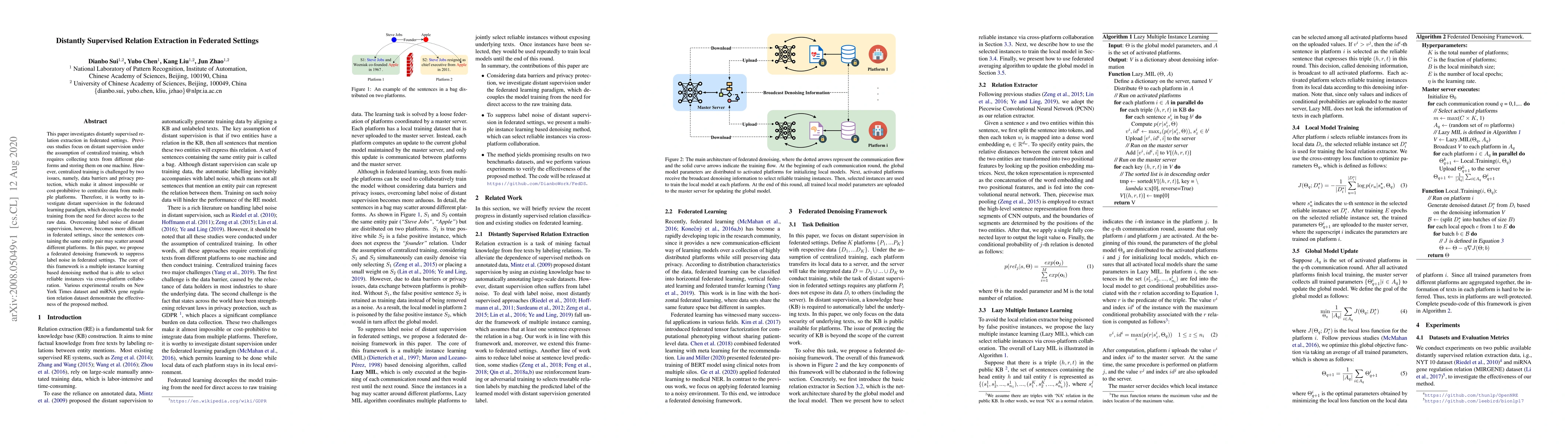 This paper proposes a federated denoising framework to tackle label noise in distantly supervised relation extraction in federated learning settings, using a multiple instance learning approach for cross-platform instance selection and demonstrates its effectiveness through experiments on New York Times and miRNA datasets.