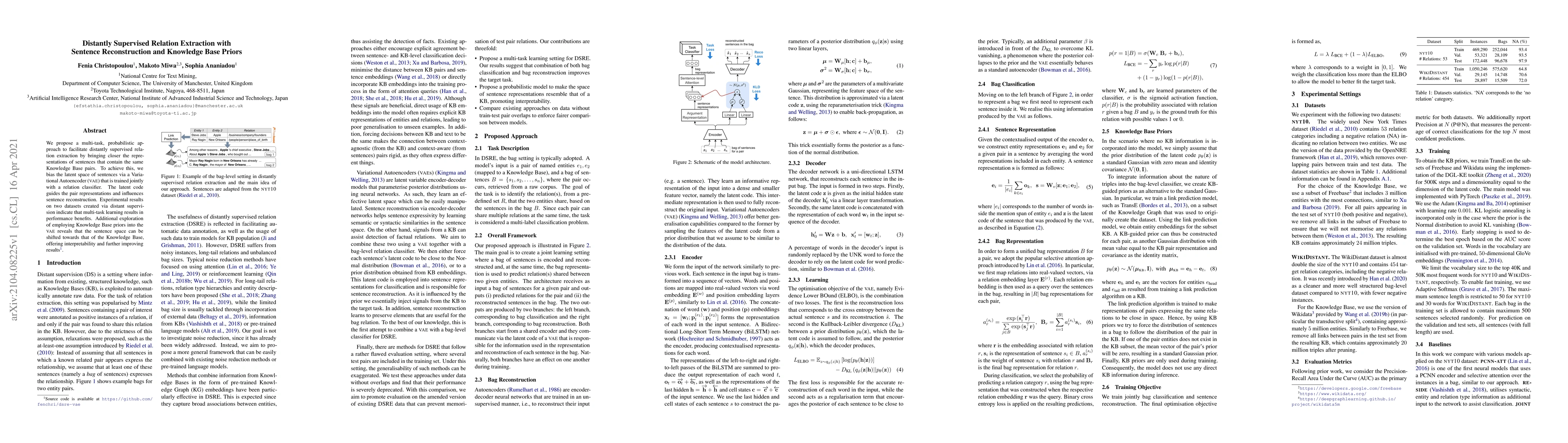 This paper introduces a multi-task, probabilistic method for distantly supervised relation extraction, utilizing a Variational Autoencoder to align sentence representations with Knowledge Base pairs. The approach enhances performance and interpretability through joint training with a relation classifier and the incorporation of Knowledge Base priors.