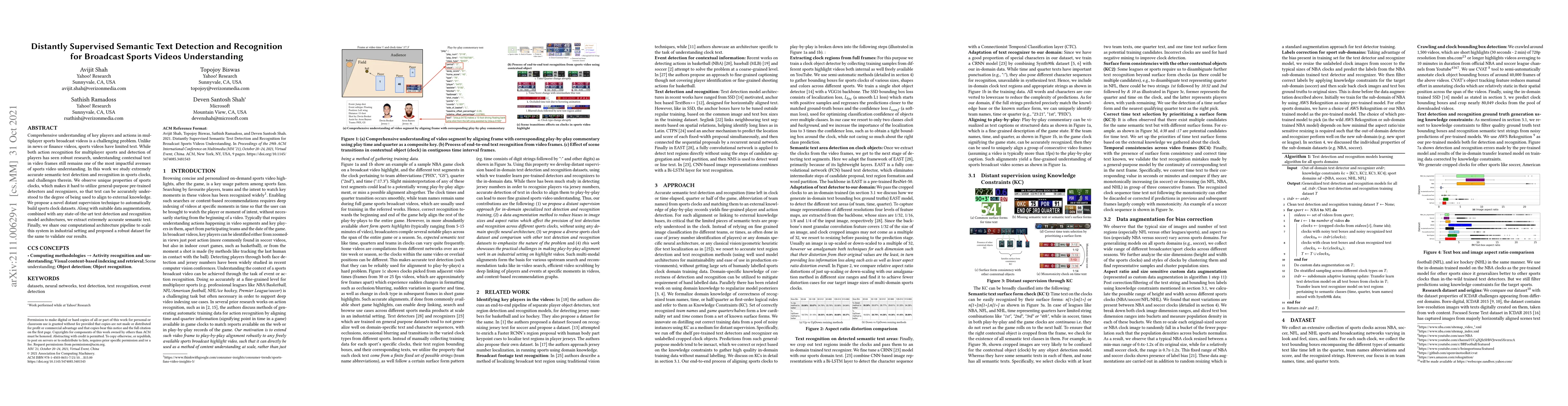 This paper proposes a novel distant supervision technique for accurately detecting and recognizing semantic text in sports broadcast videos, specifically focusing on sports clocks. The authors address the unique challenges of sports video text understanding and introduce a scalable computational architecture to validate their approach.