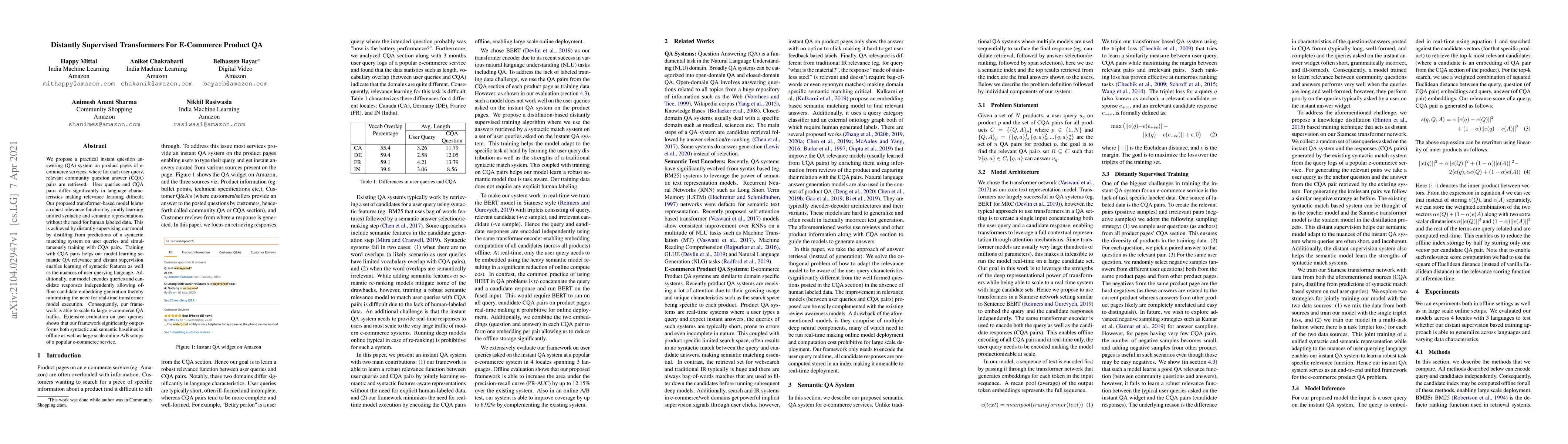 We propose a practical instant question answering (QA) system on product pages of ecommerce services, where for each user query, relevant community question answer (CQA) pairs are retrieved. User queries and CQA pairs differ significantly in language characteristics making relevance learning difficult. Our proposed transformer-based model learns a robust relevance function by jointly learning unified syntactic and semantic representations without the need for human labeled data. This is achieved by distantly supervising our model by distilling from predictions of a syntactic matching system on user queries and simultaneously training with CQA pairs. Training with CQA pairs helps our model learning semantic QA relevance and distant supervision enables learning of syntactic features as well as the nuances of user querying language. Additionally, our model encodes queries and candidate responses independently allowing offline candidate embedding generation thereby minimizing the need for real-time transformer model execution. Consequently, our framework is able to scale to large e-commerce QA traffic. Extensive evaluation on user queries shows that our framework significantly outperforms both syntactic and semantic baselines in offline as well as large scale online A/B setups of a popular e-commerce service.