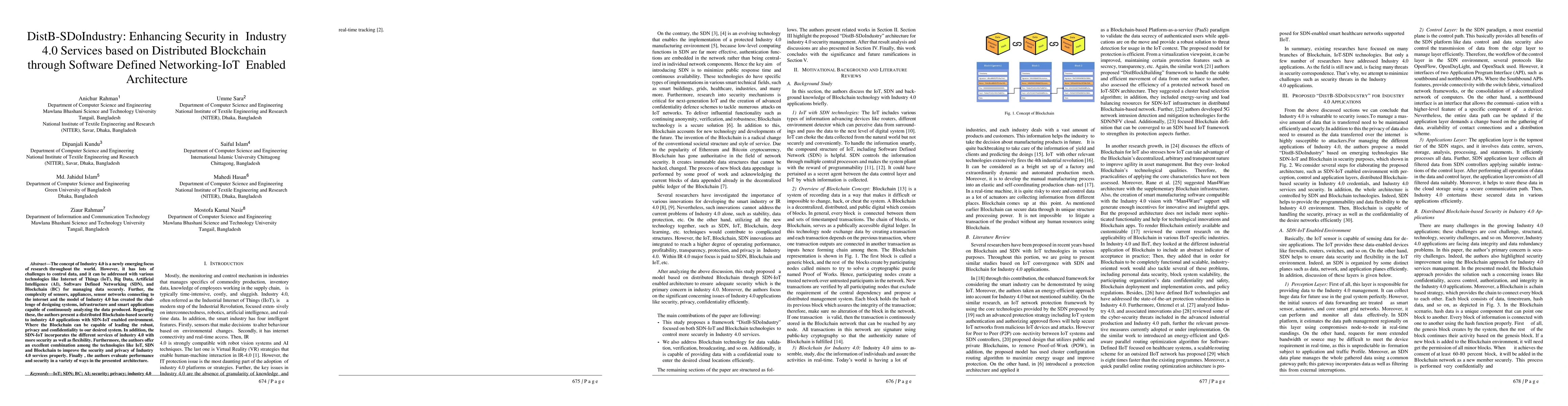 This paper proposes a distributed Blockchain-based security framework for Industry 4.0 services, leveraging Software Defined Networking (SDN) and Internet of Things (IoT) to enhance data security and privacy. The proposed architecture is evaluated for performance and security improvements.