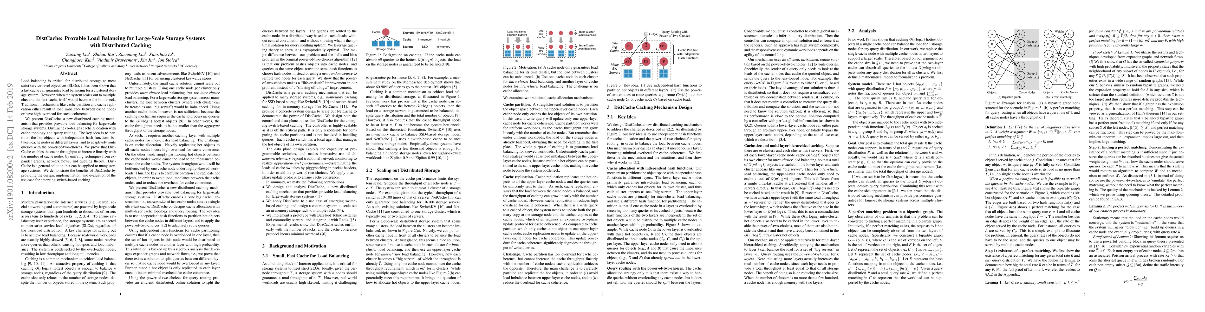 DistCache presents a novel distributed caching mechanism that achieves provable load balancing in large-scale storage systems by partitioning hot objects with independent hash functions and adaptive query routing. It leverages techniques from expander graphs, network flows, and queuing theory to ensure linear cache throughput growth with the number of cache nodes.