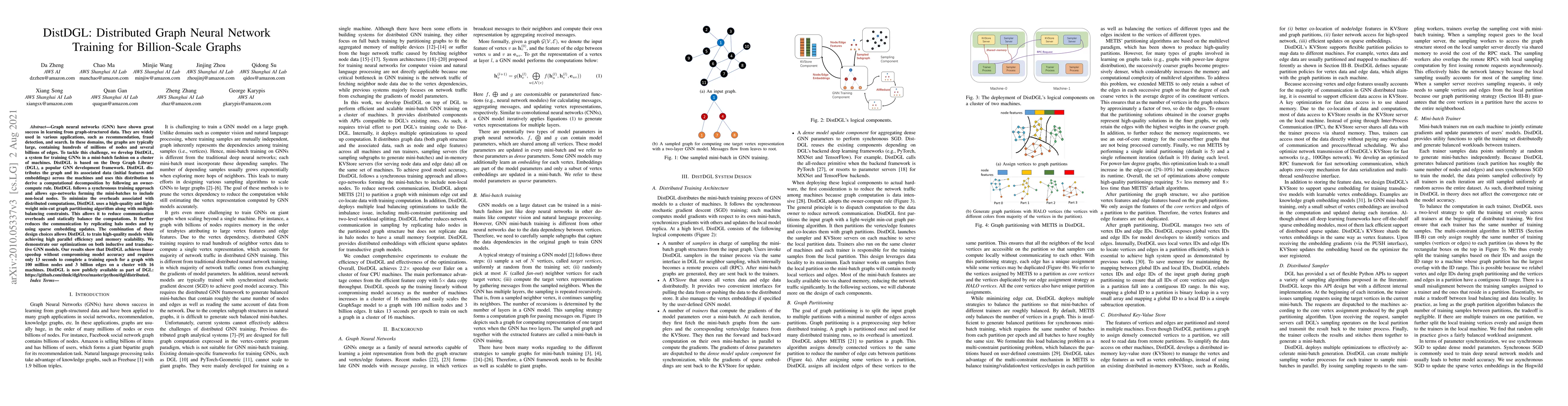 DistDGL is a distributed system for training graph neural networks (GNNs) on large-scale graphs, achieving high parallel efficiency and scalability through mini-batch training and optimized graph partitioning. It demonstrates linear speedup and maintains model accuracy, completing a training epoch for a 100 million node graph in just 13 seconds on a 16-machine cluster.
