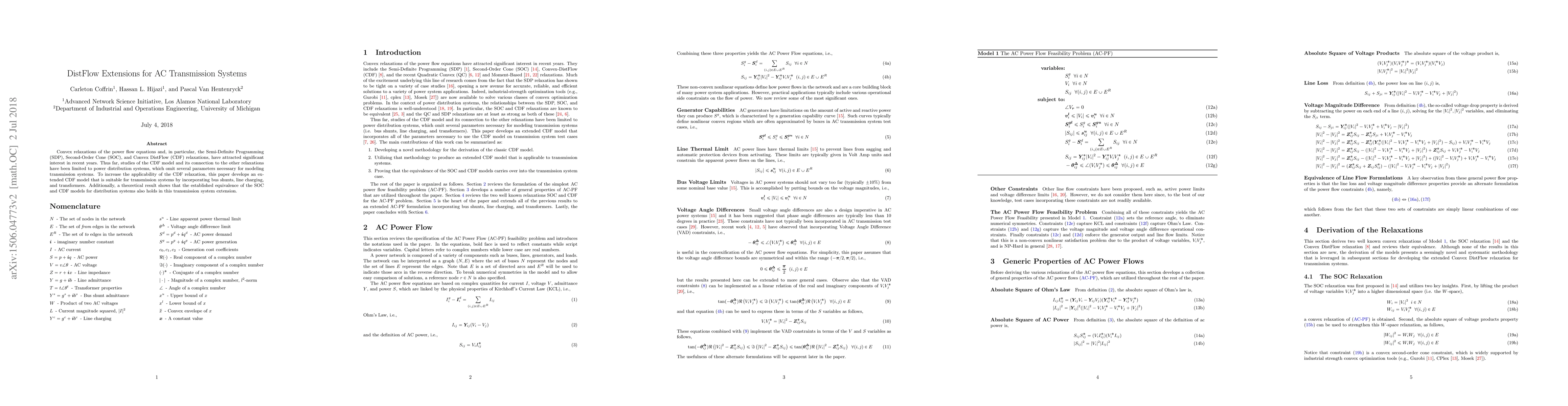 Convex relaxations of the power flow equations and, in particular, the Semi-Definite Programming (SDP), Second-Order Cone (SOC), and Convex DistFlow (CDF) relaxations, have attracted significant interest in recent years. Thus far, studies of the CDF model and its connection to the other relaxations have been limited to power distribution systems, which omit several parameters necessary for modeling transmission systems. To increase the applicability of the CDF relaxation, this paper develops an extended CDF model that is suitable for transmission systems by incorporating bus shunts, line charging, and transformers. Additionally, a theoretical result shows that the established equivalence of the SOC and CDF models for distribution systems also holds in this transmission system extension.