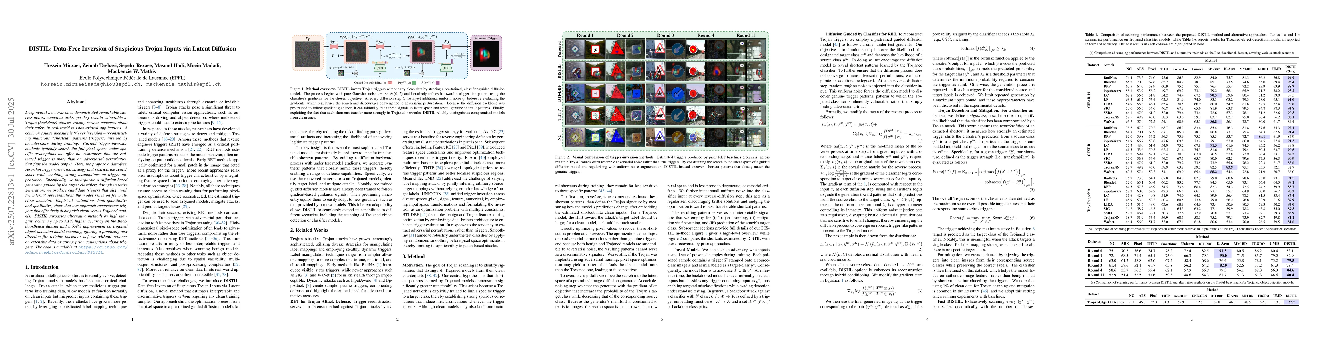 Deep neural networks have demonstrated remarkable success across numerous tasks, yet they remain vulnerable to Trojan (backdoor) attacks, raising serious concerns about their safety in real-world mission-critical applications. A common countermeasure is trigger inversion -- reconstructing malicious "shortcut" patterns (triggers) inserted by an adversary during training. Current trigger-inversion methods typically search the full pixel space under specific assumptions but offer no assurances that the estimated trigger is more than an adversarial perturbation that flips the model output. Here, we propose a data-free, zero-shot trigger-inversion strategy that restricts the search space while avoiding strong assumptions on trigger appearance. Specifically, we incorporate a diffusion-based generator guided by the target classifier; through iterative generation, we produce candidate triggers that align with the internal representations the model relies on for malicious behavior. Empirical evaluations, both quantitative and qualitative, show that our approach reconstructs triggers that effectively distinguish clean versus Trojaned models. DISTIL surpasses alternative methods by high margins, achieving up to 7.1% higher accuracy on the BackdoorBench dataset and a 9.4% improvement on trojaned object detection model scanning, offering a promising new direction for reliable backdoor defense without reliance on extensive data or strong prior assumptions about triggers. The code is available at https://github.com/AdaptiveMotorControlLab/DISTIL.