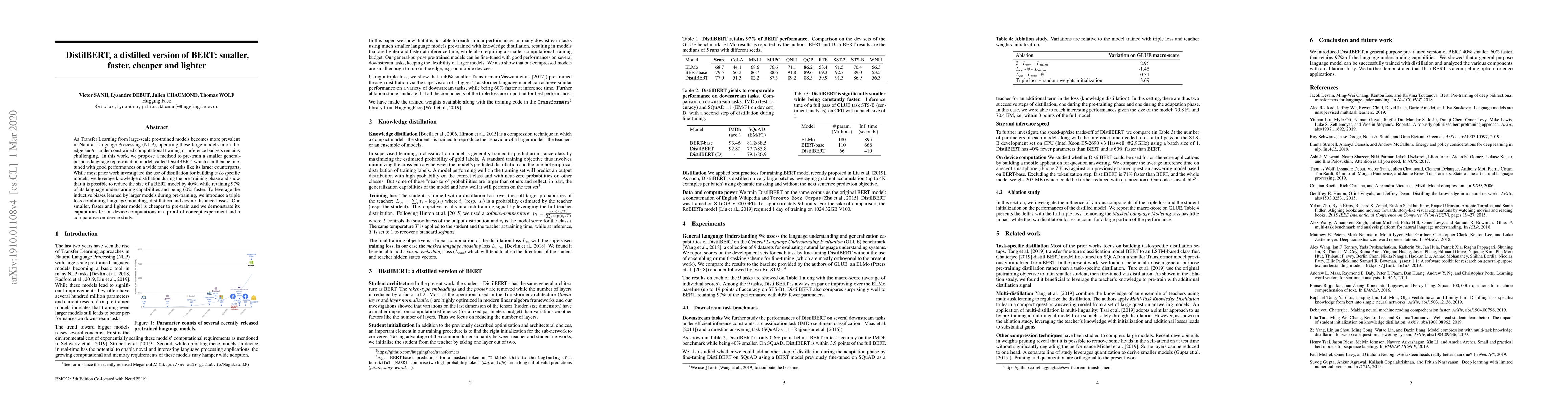 DistilBERT is a distilled version of BERT that is 40% smaller, 60% faster, and retains 97% of its language understanding capabilities. The model uses knowledge distillation during pre-training and is shown to be effective for on-device computations.