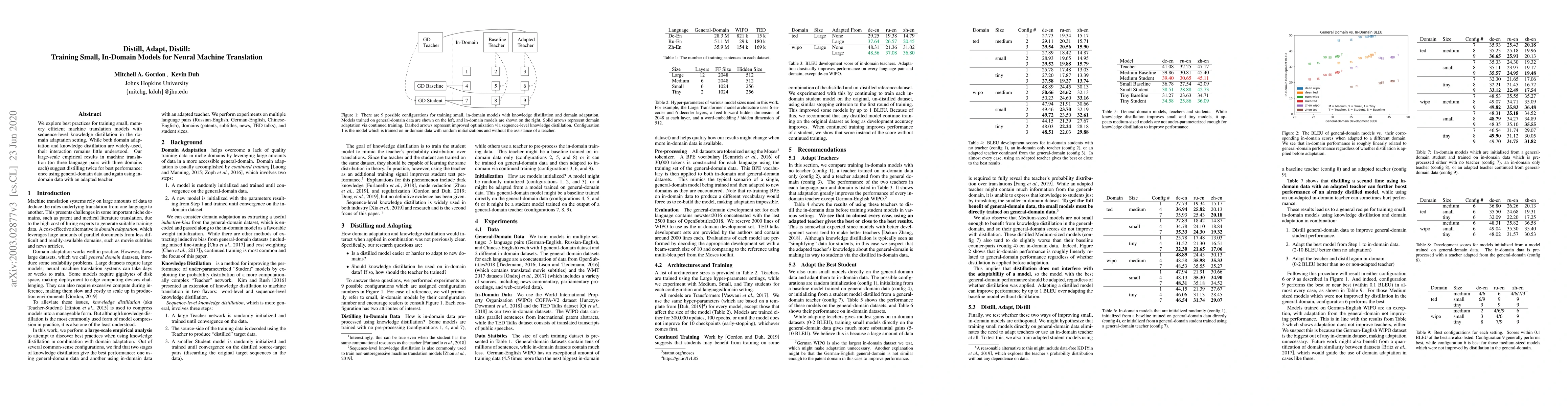 We explore best practices for training small, memory efficient machine translation models with sequence-level knowledge distillation in the domain adaptation setting. While both domain adaptation and knowledge distillation are widely-used, their interaction remains little understood. Our large-scale empirical results in machine translation (on three language pairs with three domains each) suggest distilling twice for best performance: once using general-domain data and again using in-domain data with an adapted teacher.