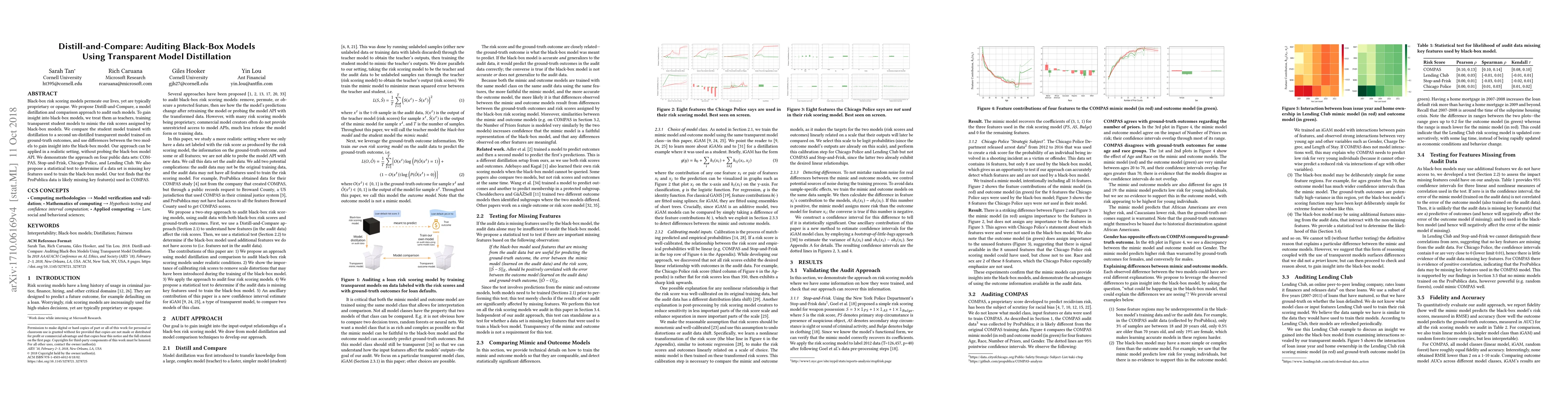 The paper introduces Distill-and-Compare, a method to audit black-box risk scoring models by distilling them into transparent student models, comparing these to un-distilled transparent models, and using differences to gain insights into the black-box. The approach is demonstrated on four public datasets and includes a statistical test to identify missing key features in the training data.
