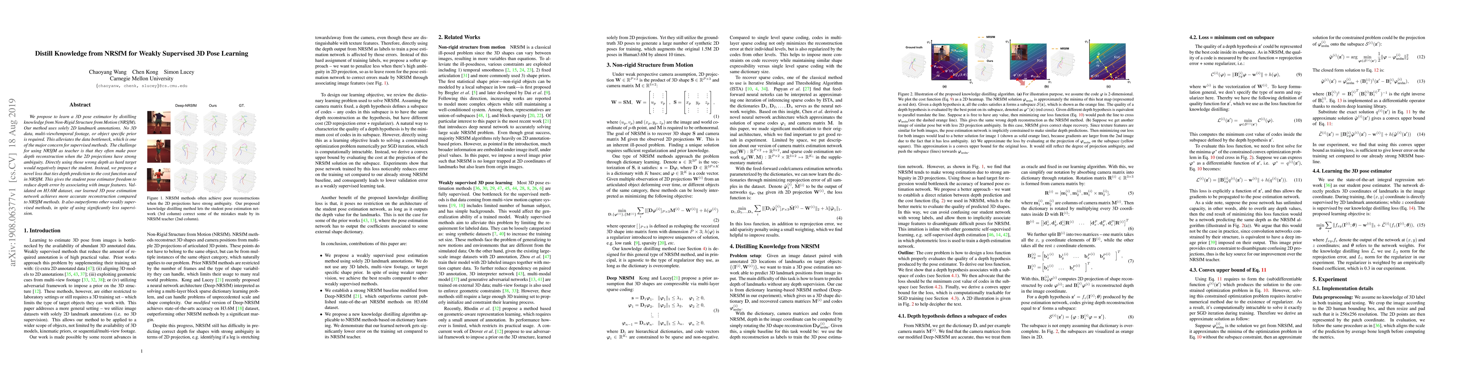 We propose to learn a 3D pose estimator by distilling knowledge from Non-Rigid Structure from Motion (NRSfM). Our method uses solely 2D landmark annotations. No 3D data, multi-view/temporal footage, or object specific prior is required. This alleviates the data bottleneck, which is one of the major concern for supervised methods. The challenge for using NRSfM as teacher is that they often make poor depth reconstruction when the 2D projections have strong ambiguity. Directly using those wrong depth as hard target would negatively impact the student. Instead, we propose a novel loss that ties depth prediction to the cost function used in NRSfM. This gives the student pose estimator freedom to reduce depth error by associating with image features. Validated on H3.6M dataset, our learned 3D pose estimation network achieves more accurate reconstruction compared to NRSfM methods. It also outperforms other weakly supervised methods, in spite of using significantly less supervision.